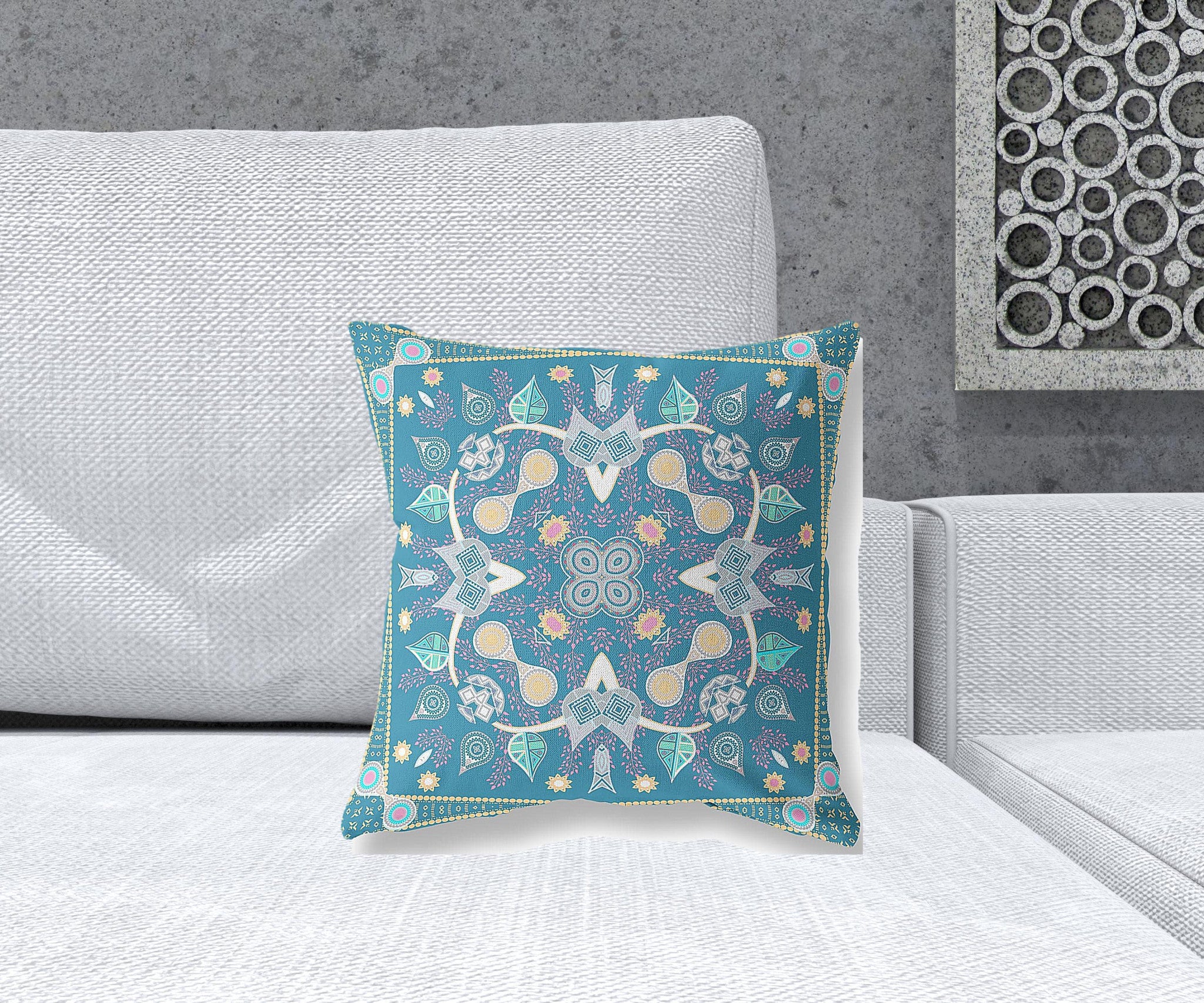 Unique and decorative, this comfortable 16" x 16" aqua blown seam floral indoor outdoor throw pillow will leave a lasting impression. This soft and durable decorative pillow is expertly made of high grade, long lasting broadcloth in a aqua coloration. A great decorative accessory to decorate indoors or out. Decorative throw pillows add some pizazz but can also be comfy and supportive when you are lounging. 5" H x 16" W x 16" D
