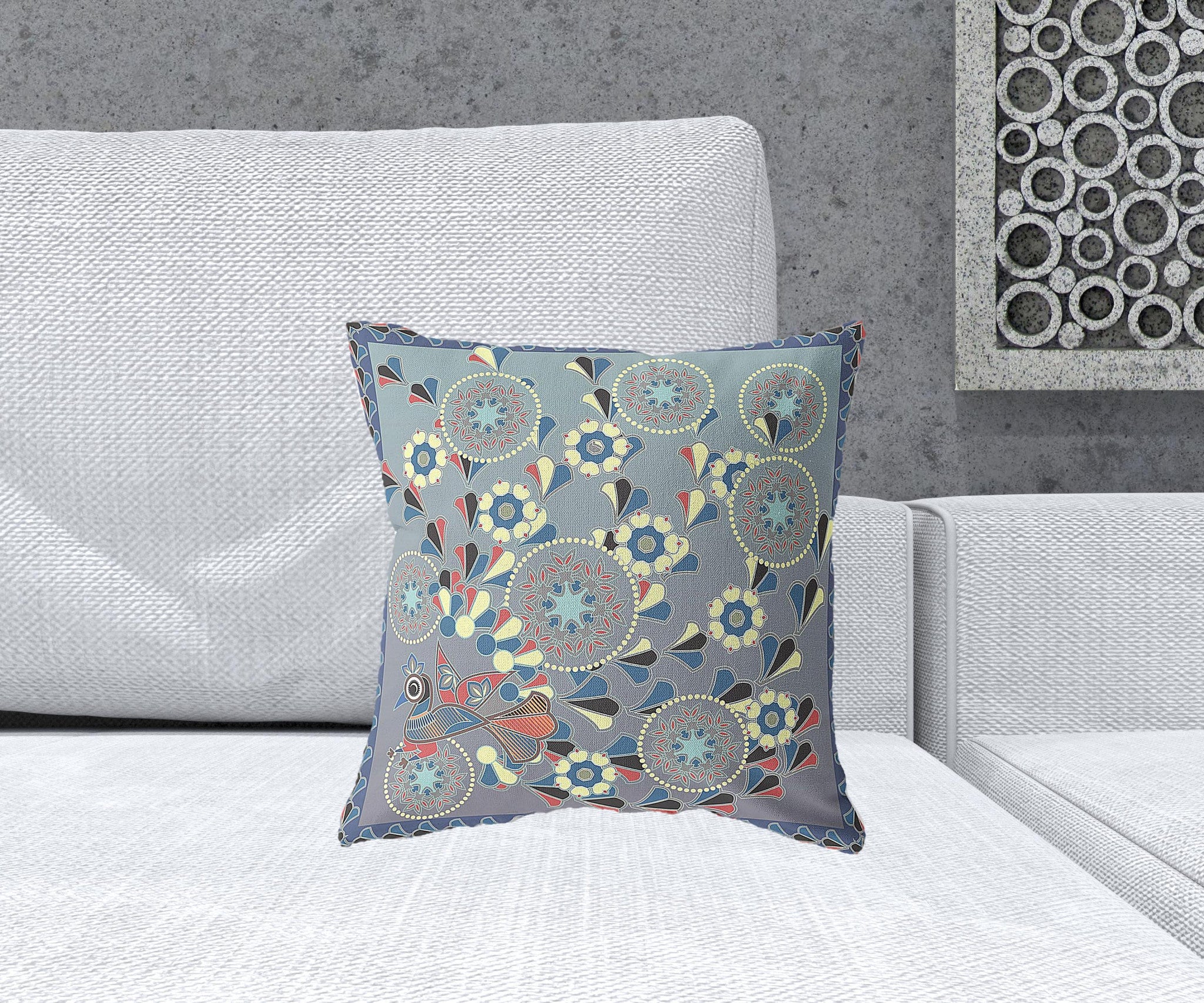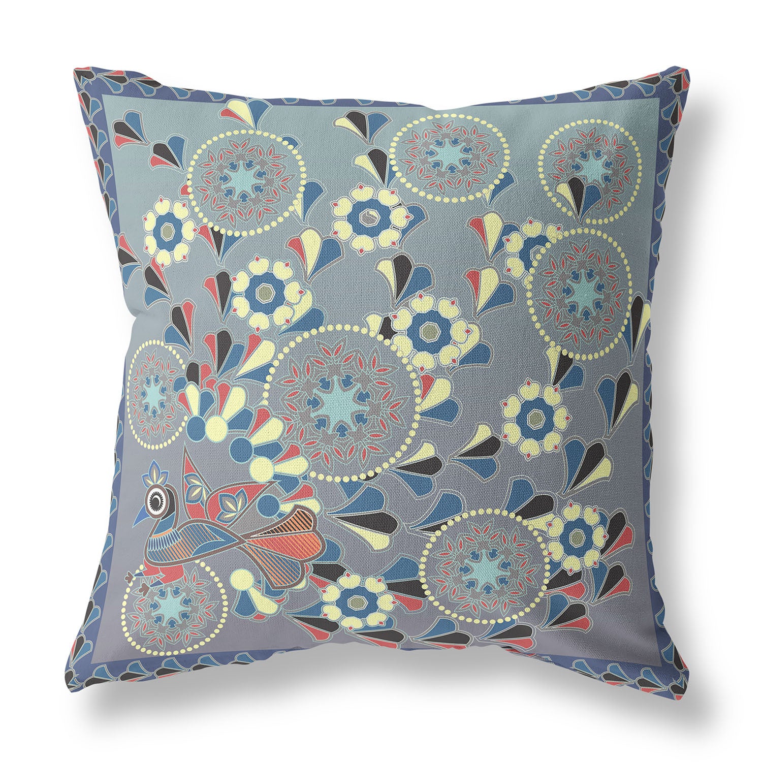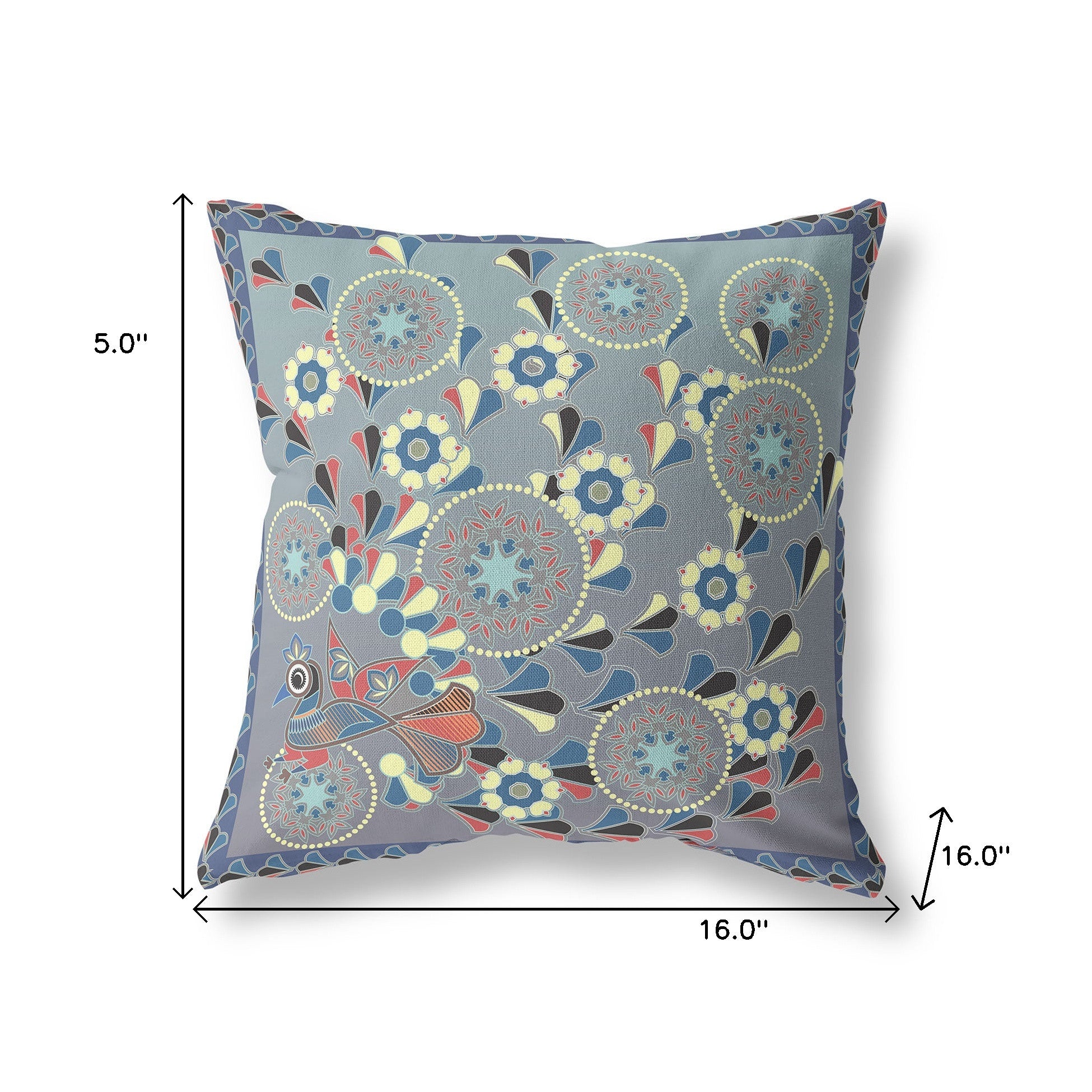 16" x 16" Blue and Gray Peacock Blown Seam Floral Indoor Outdoor Throw Pillow