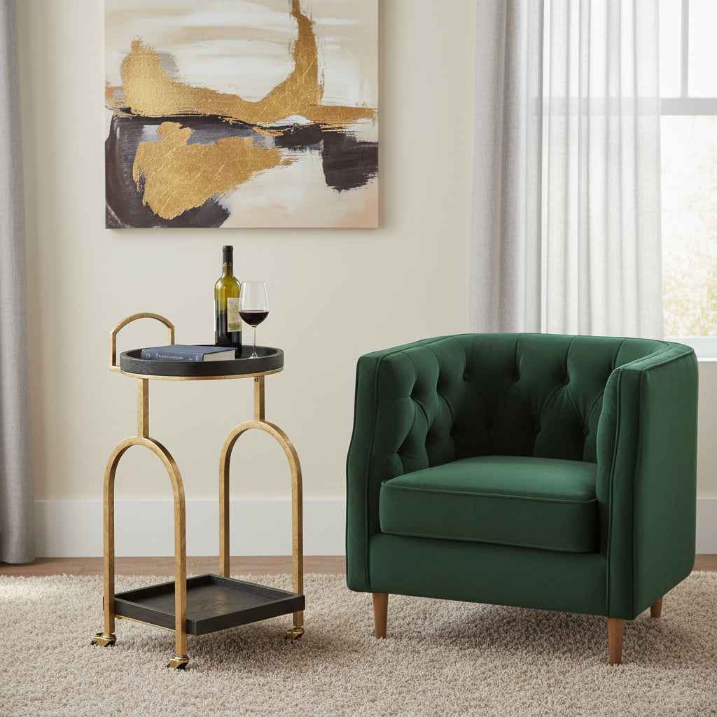 17" Black And Brass Steel and Solid Wood Distressed Round Rolling Bar Cart