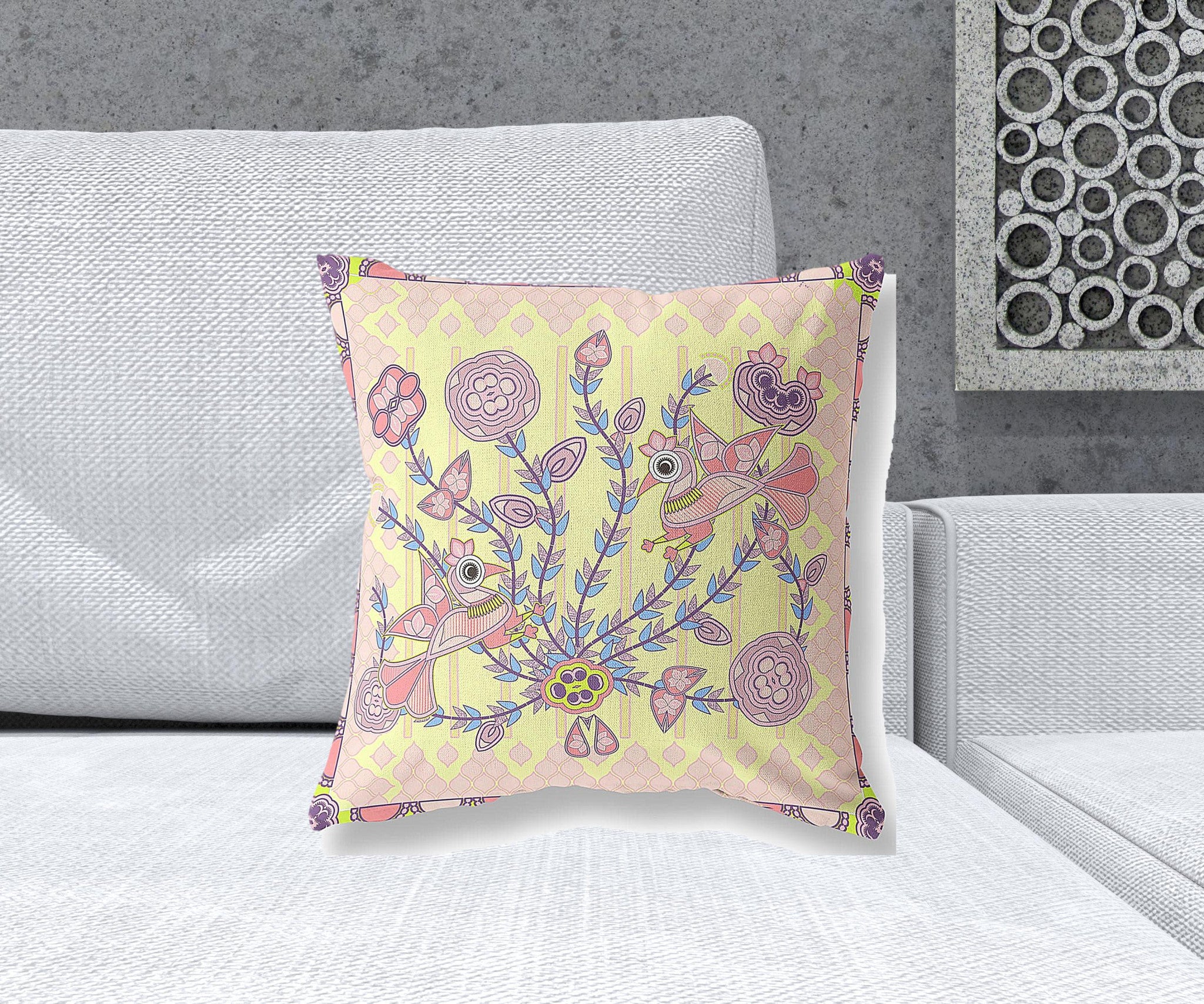The 18" x 18" yellow bird blown seam floral indoor outdoor throw pillow is the perfect decorative accessory for your home. This yellow colored decorative pillow is made from high grade broadcloth that is durable and long lasting. Will add some color and dimension to your space indoors or out. Decorative throw pillows add some pizazz but can also be comfy and supportive when you are lounging. 5" H x 18" W x 18" D