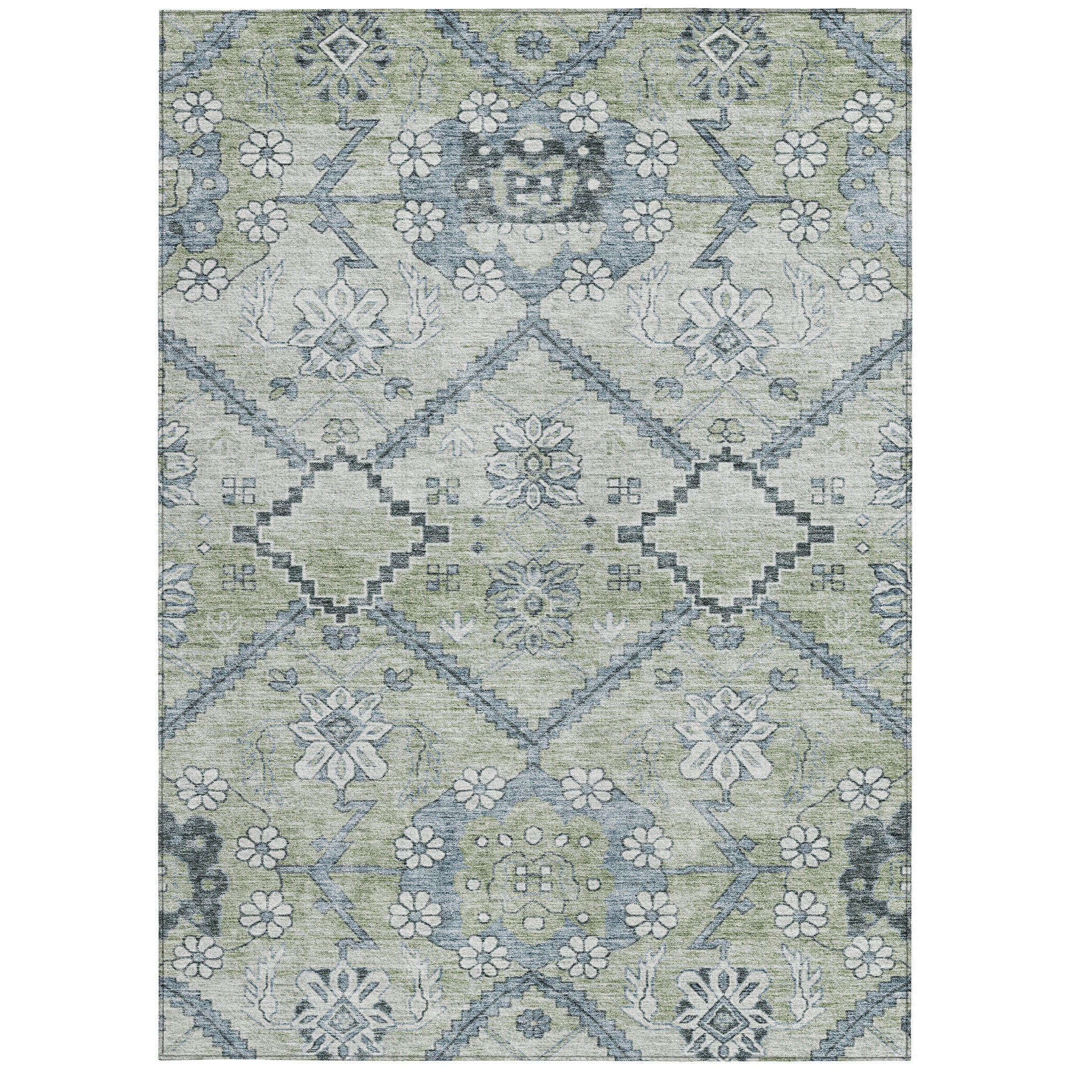 3' X 5' Artichoke Green Denim Blue And Silver Floral Washable Indoor Outdoor Area Rug