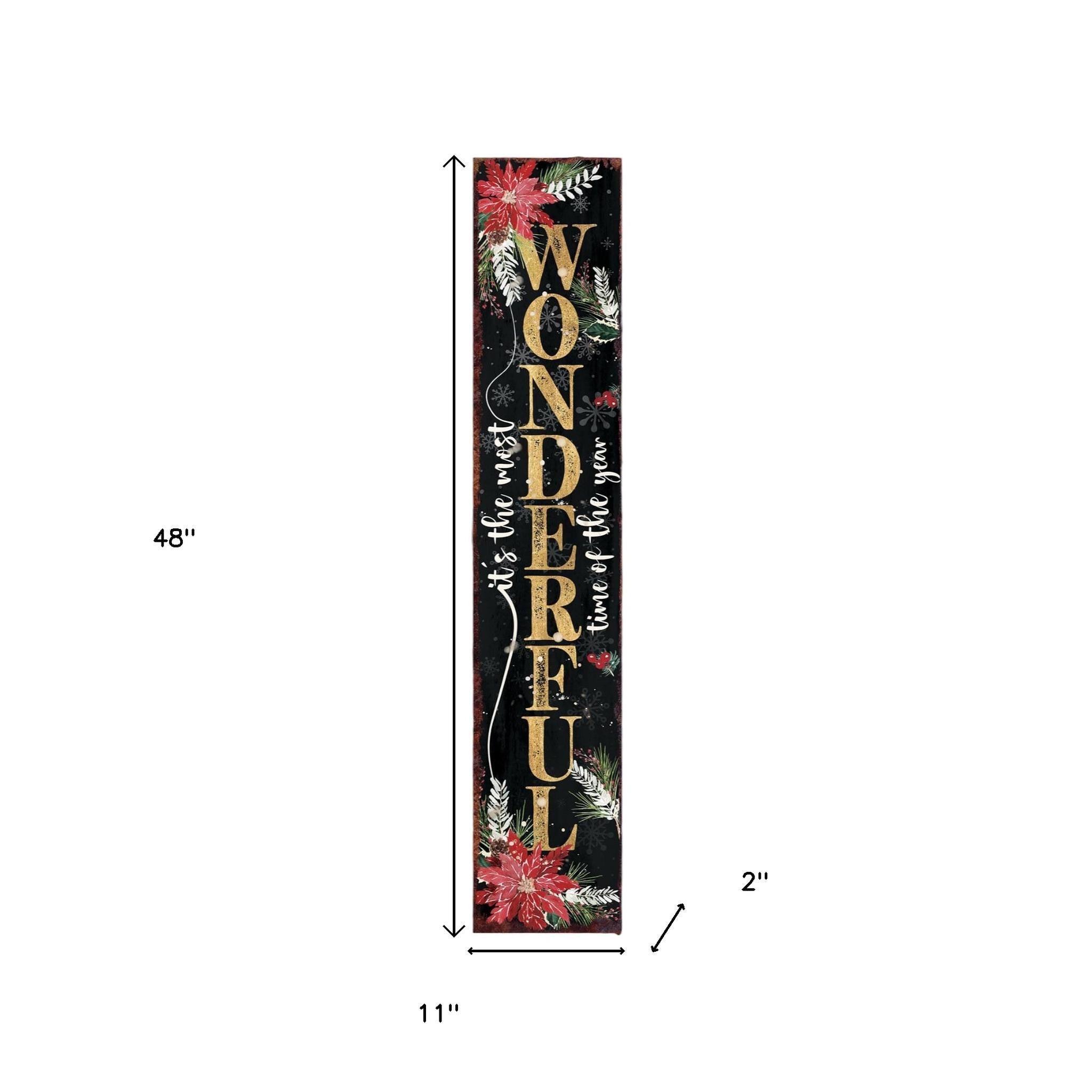 The 48-inch black gold red and green christmas poinsettia solid wood porch sign adds a festive touch to your outdoor decor. Crafted from solid wood, this traditional porch sign is designed to enhance your holiday ambiance. The rich color palette of black, gold, red, and green beautifully captures the spirit of christmas, making it a charming addition to your home. Its elegant design not only welcomes guests but also celebrates the joy of the season. This accessory serves as a perfect focal point for your porch, creating a warm and inviting atmosphere for gatherings. Elevate your outdoor space with this eye-catching sign that embodies holiday cheer and timeless style. 48.00-inch h x 11.00-inch w x 2.00-inch d.