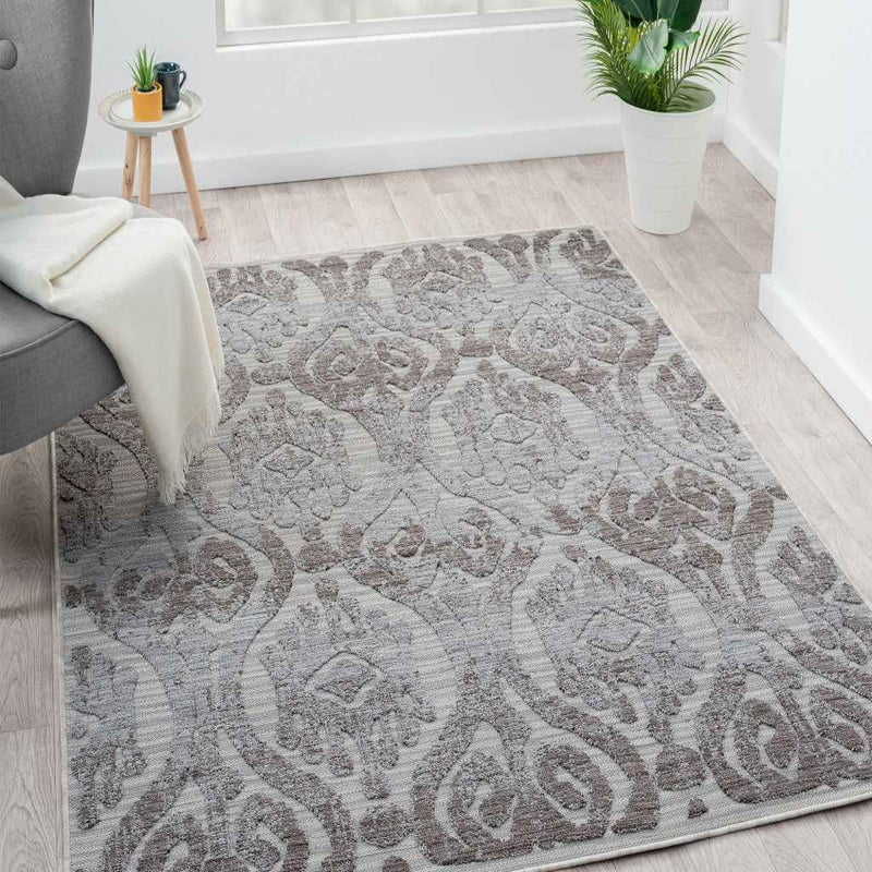 Add some artistry to your room with this 5' x 7' blue and gray damask indoor outdoor area rug. This rectangle shaped rug features a damask design in blue and gray to give it visual interest. A classic shape marries with good looking design for your space This superior Turkish rug represents the highest quality and is built to last. Place this area rug against a hardwood or tile floor and it will enliven your living space with style and sophistication. 0.35" H x 60" W x 84" D