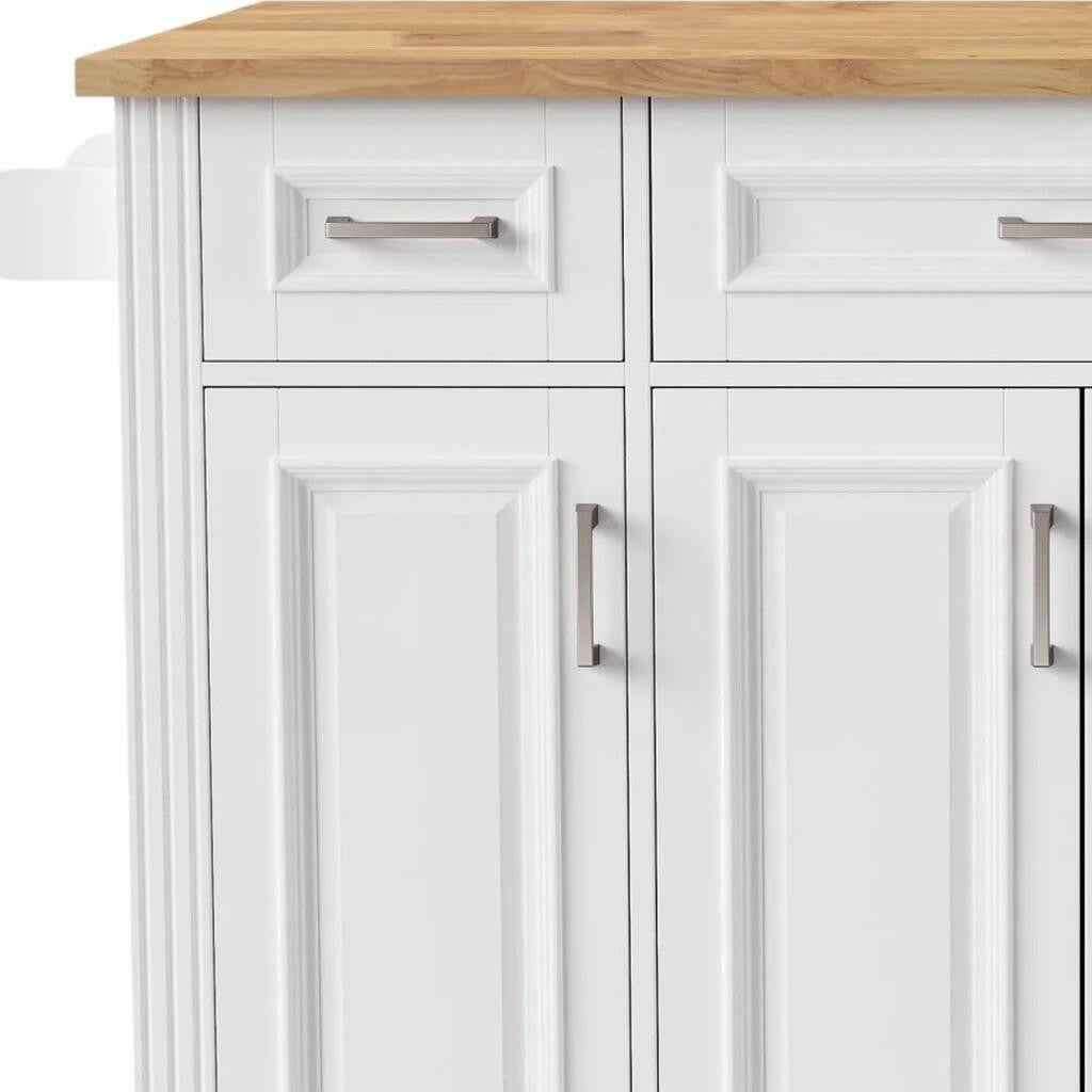 The addition of an island or cart can be used for a variety of tasks, from food preparation and cooking to serving and dining. This 54-inch white wood rolling kitchen island with storage stands out from the rest because of its excellent design and versatility. This durable solid and manufactured wood rectangular island frees up a tremendous amount of space in your kitchen area, allowing you more flexibility as you prepare meals or serve guests. The beautiful grains and natural variations of the solid wood give this piece its own unique appearance. Drawer storage also helps to keep those handy utensils and serving essentials neat, tidy, and ready to be used. Do you ever find yourself searching for more space when meal prepping. This unit includes a drop leaf, which allows you to expand or scale down your counter space. Maximize your space with this multi- functional and good looking kitchen island. 35.90-inch h x 54.10-inch w x 29.50-inch d.