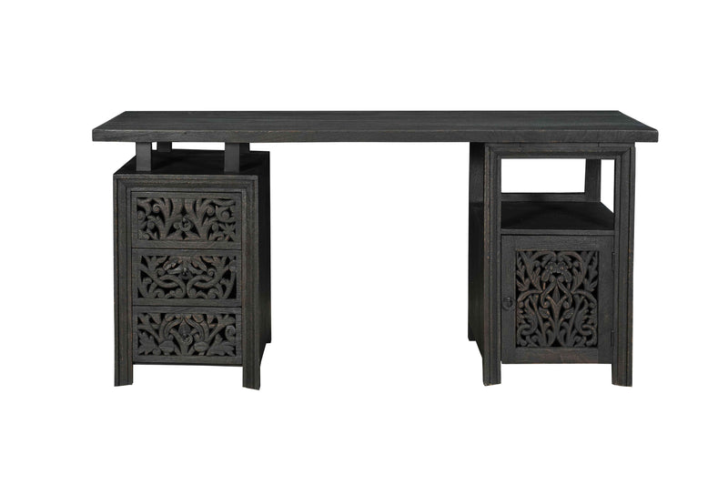 68" Black Solid Wood and Metal Carved Floral Desk With Three Drawers