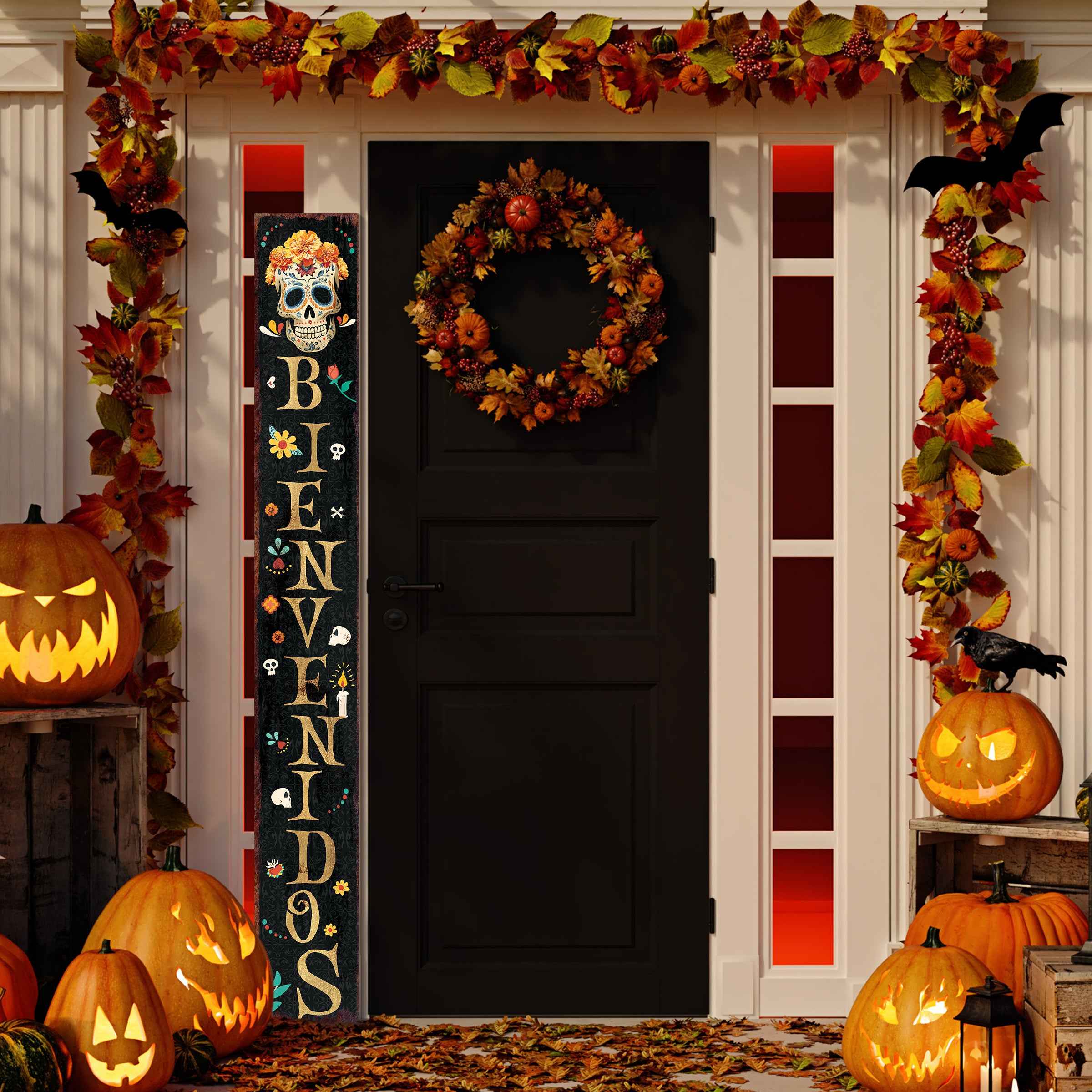 The 72-inch black gold and orange solid wood bienvenidos skull porch sign is an eye-catching addition to your outdoor space. Crafted from solid wood, this porch sign blends durability with traditional style, making it perfect for welcoming guests. The striking color combination of black, gold, and orange adds a festive touch that complements the fall season beautifully. This unique garden accessory serves as both decor and a playful game for family gatherings, enhancing the atmosphere of your porch. Its size ensures it stands out, creating a memorable focal point at your entrance. Elevate your outdoor decor with this charming piece that embodies the spirit of autumn while inviting warmth and cheer to your home. 72.00-inch h x 10.00-inch w x 2.00-inch d.