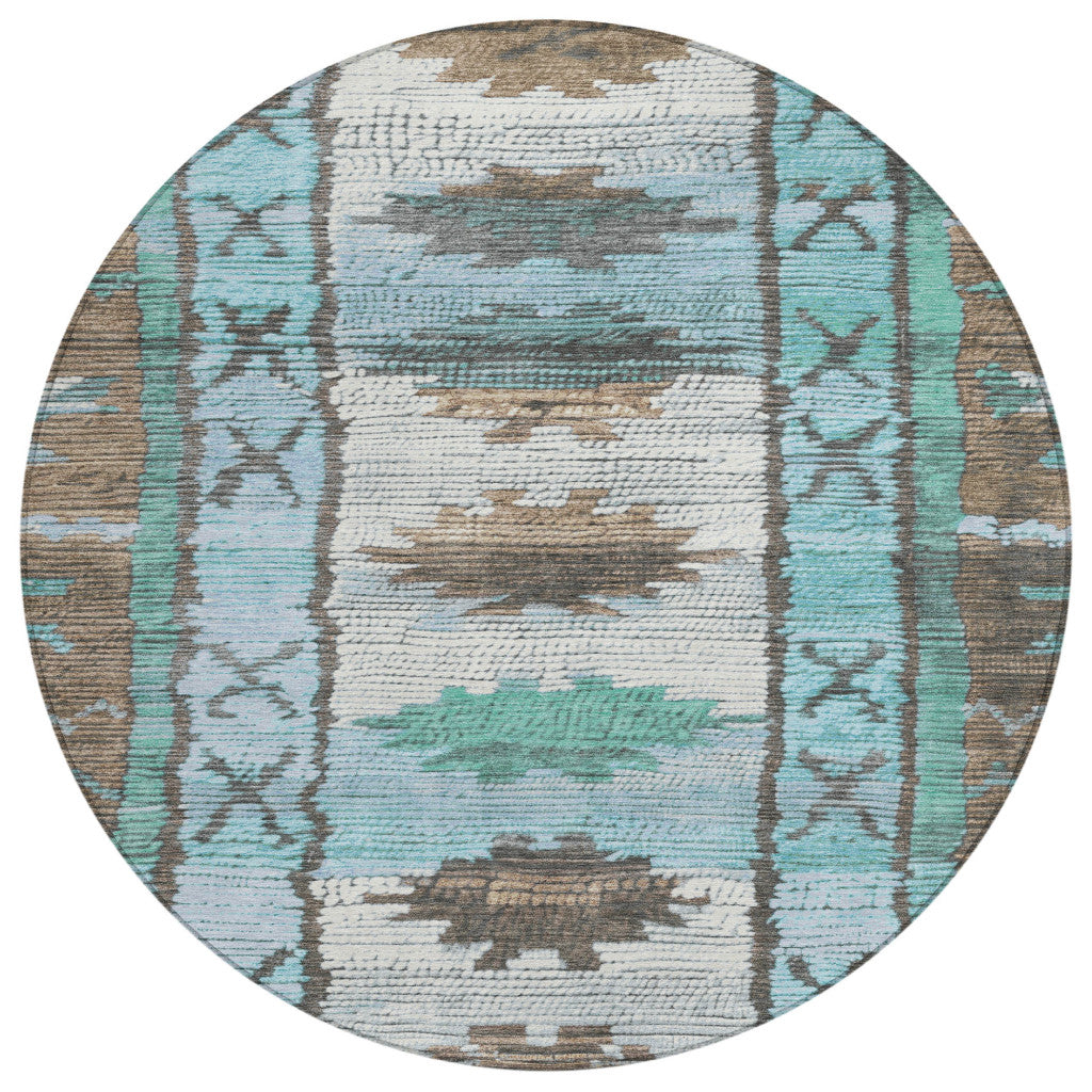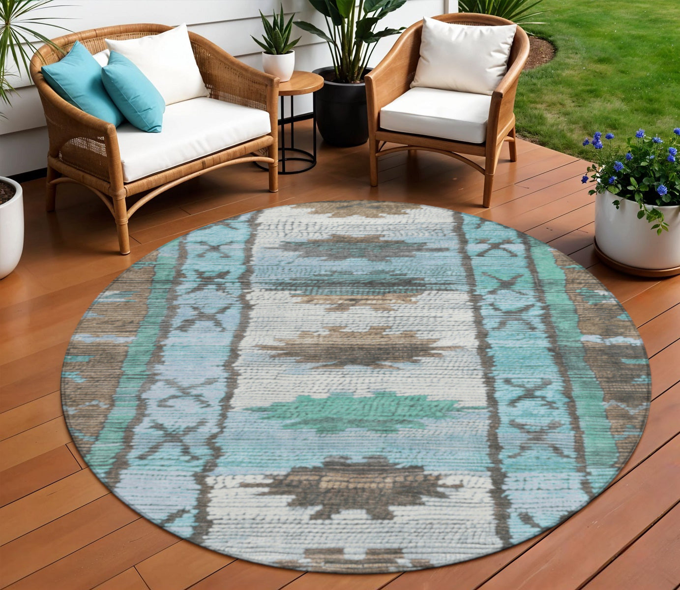 8' Brown And Teal Blue Round Tribal Washable Indoor Outdoor Area Rug