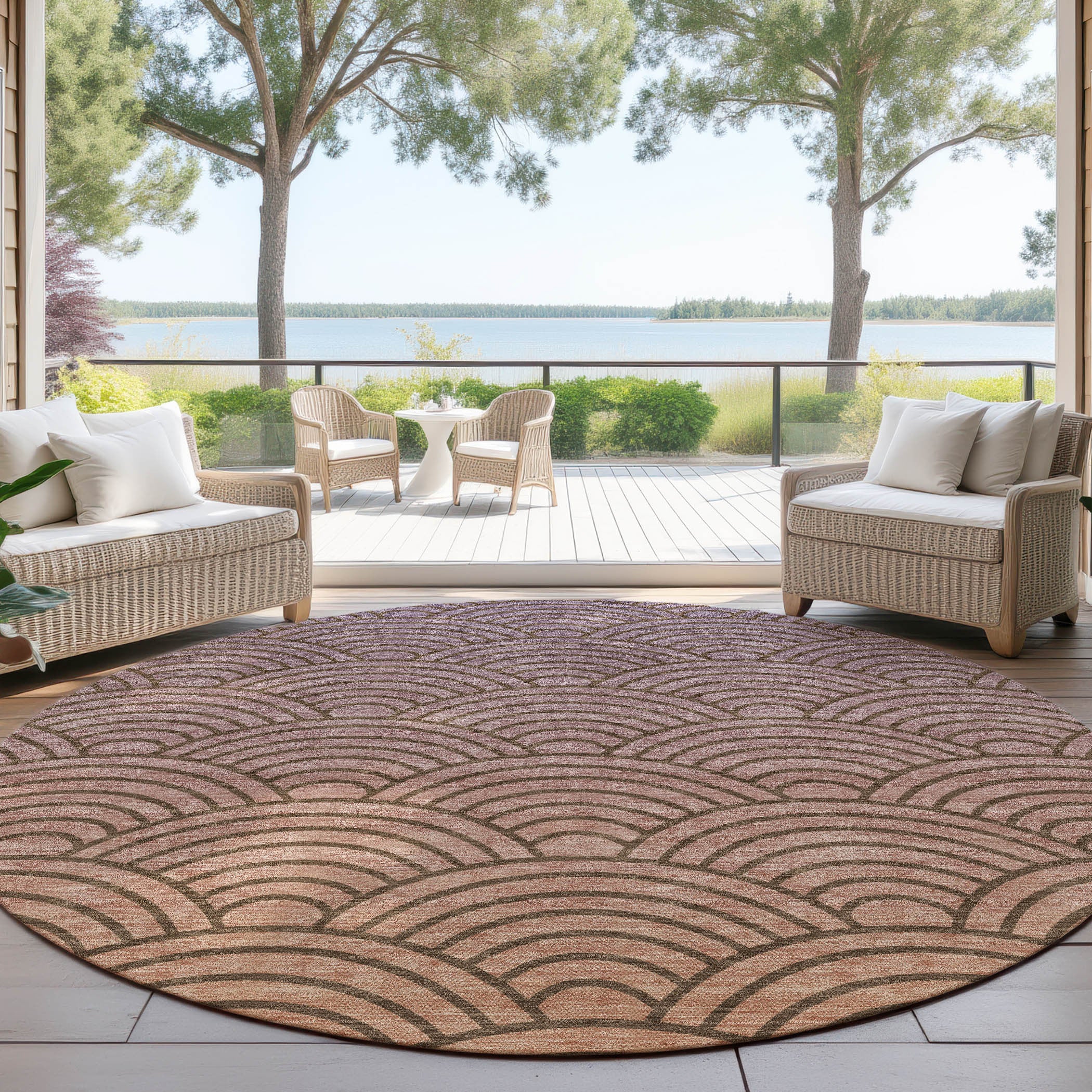 This 8-foot chocolate purple and mauve round geometric washable indoor outdoor area rug, is a great way to add warmth to a room. This geometric round shaped rug features a geometric pattern in chocolate, purple, and mauve that combines a good looking print with a unique and updated shape. The mix of shape, color, and design gives this rug refreshing visual interest. Ideal for outdoor spaces or high traffic areas with kids and pets, this rug is made from heavy duty polyester that is stain resistant to help repel water, dirt, and stains. Makes a great way to dress up your patio, porch, or poolside, but also works well as a durable and easy to maintain option in the kitchen, family room, or mudroom. 96.00-inch h x 96.00-inch w x 0.19-inch d.