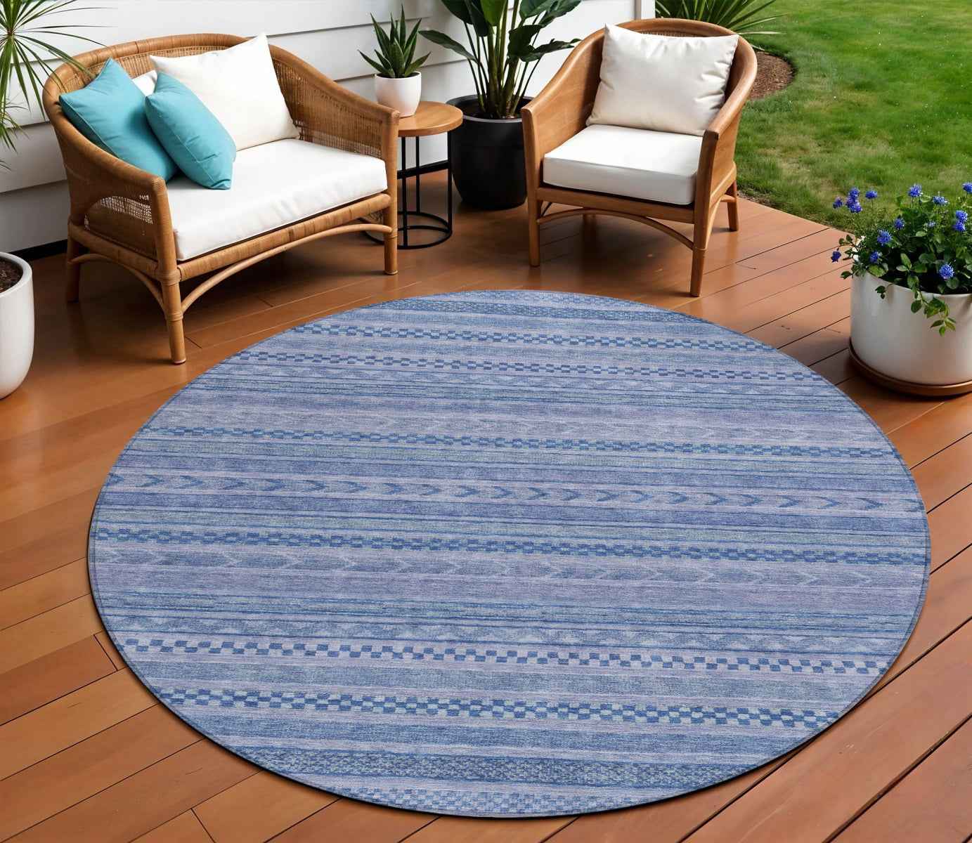 8' Denim Blue And Sky Blue Round Striped Washable Indoor Outdoor Area Rug