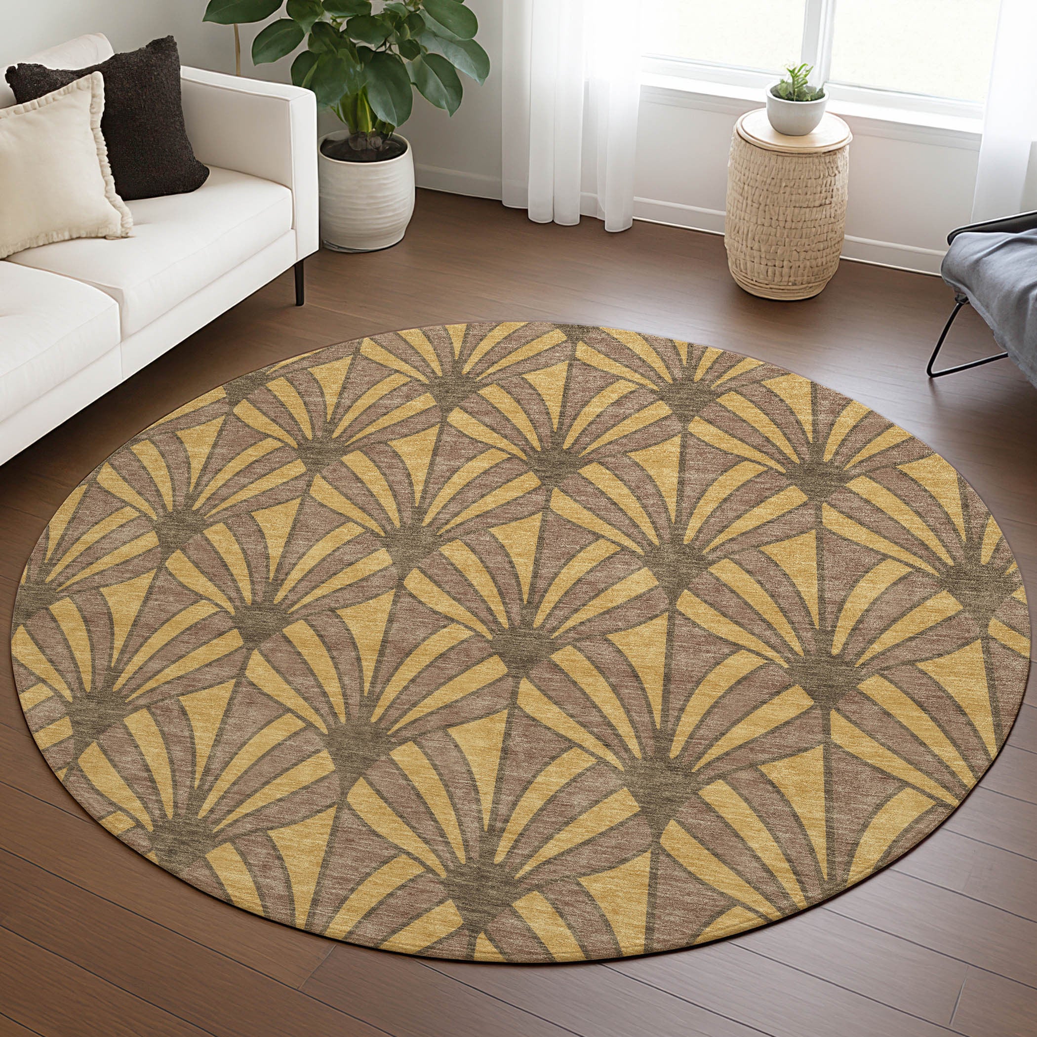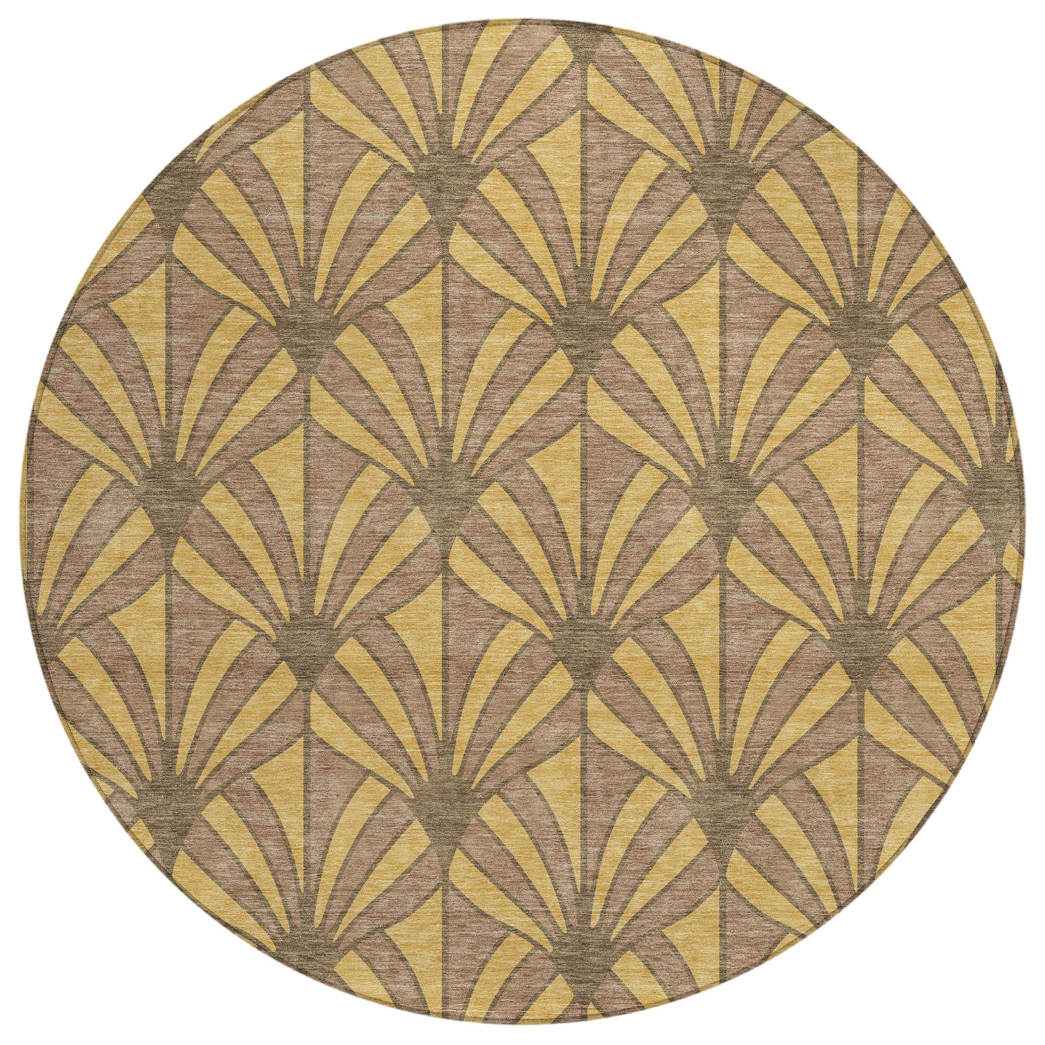 Add great coloration and comfortable texture to your space with this 8-foot gold and brown round seashell washable indoor outdoor area rug. This geometric round shaped rug features a seashell pattern in gold and brown that combines a good looking print with a unique and updated shape. The mix of shape, color, and design gives this rug refreshing visual interest. Ideal for outdoor spaces or high traffic areas with kids and pets, this rug is made from heavy duty polyester that is stain resistant to help repel water, dirt, and stains. Versatile in use, durable, and easy to maintain, this rug is an ideal solution to add a decorative and inviting touch to your indoor or outdoor space. 96.00-inch h x 96.00-inch w x 0.19-inch d.