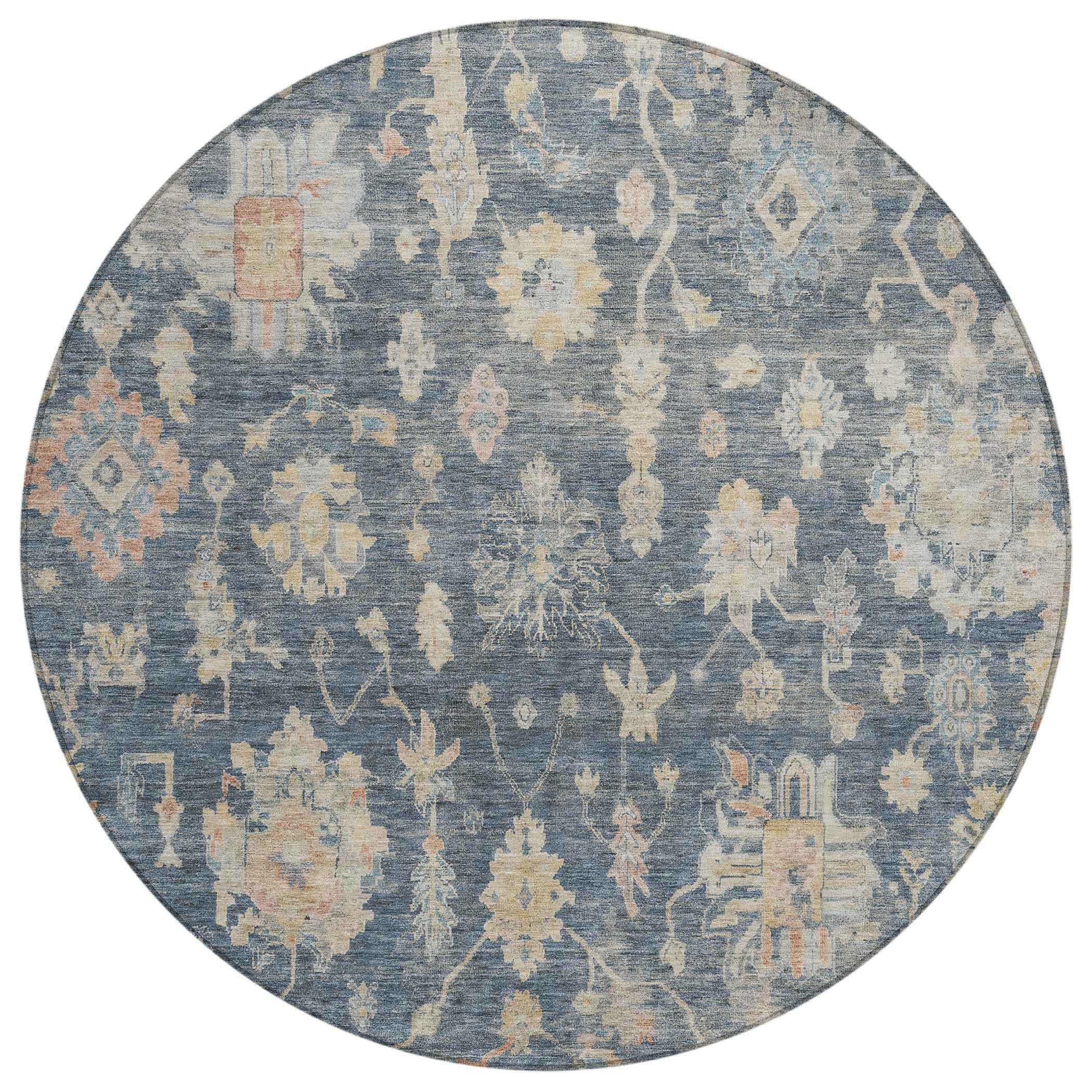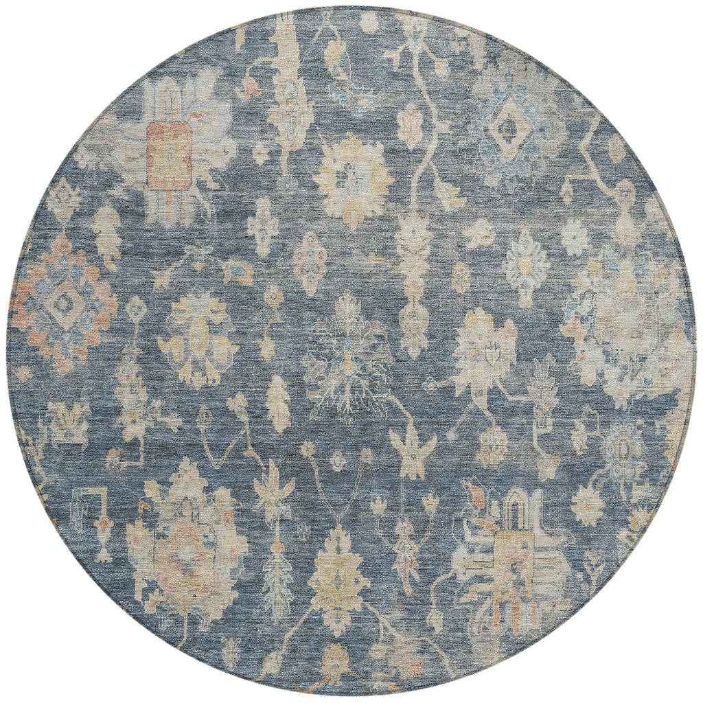 8' Navy Blue Beige And Rust Round Floral Washable Indoor Outdoor Area Rug