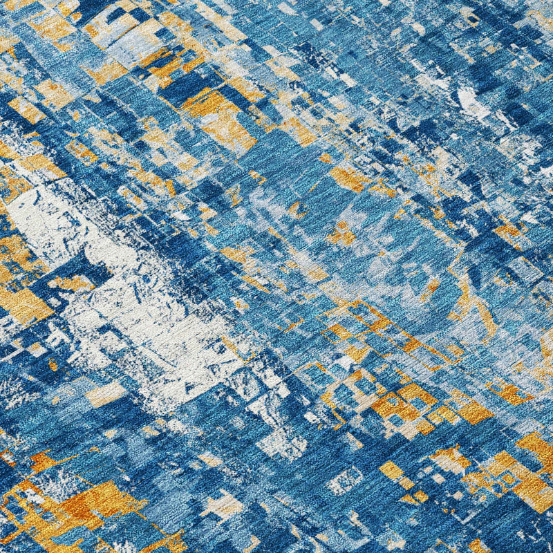 Add some artistry to your room with this 8-foot navy blue gold and ivory round abstract washable indoor outdoor area rug. This geometric round shaped rug features a abstract pattern in navy blue, gold, and ivory that combines a good looking print with a unique and updated shape. The mix of shape, color, and design gives this rug refreshing visual interest. Ideal for outdoor spaces or high traffic areas with kids and pets, this rug is made from heavy duty polyester that is stain resistant to help repel water, dirt, and stains. Versatile in use, durable, and easy to maintain, this rug is an ideal solution to add a decorative and inviting touch to your indoor or outdoor space. 96-inch h x 96-inch w x 0.19-inch d.