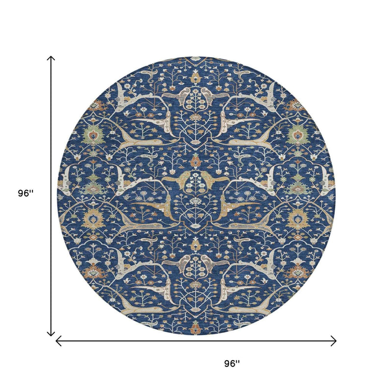 8' Navy Blue Ivory And Gold Round Floral Washable Indoor Outdoor Area Rug