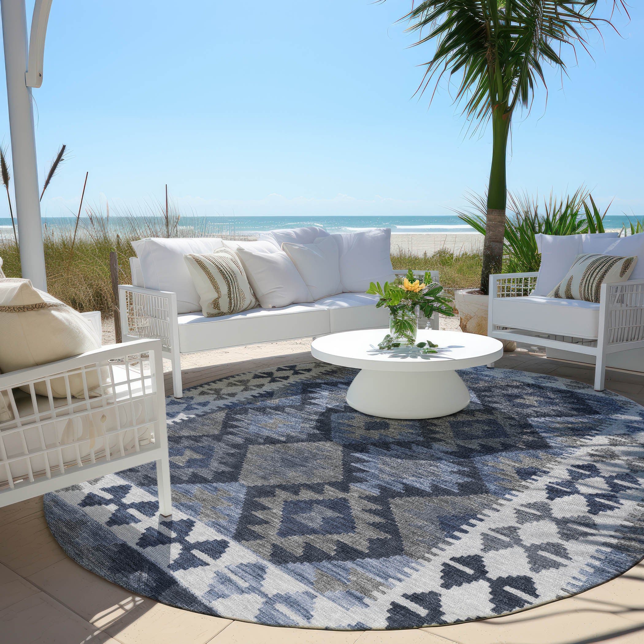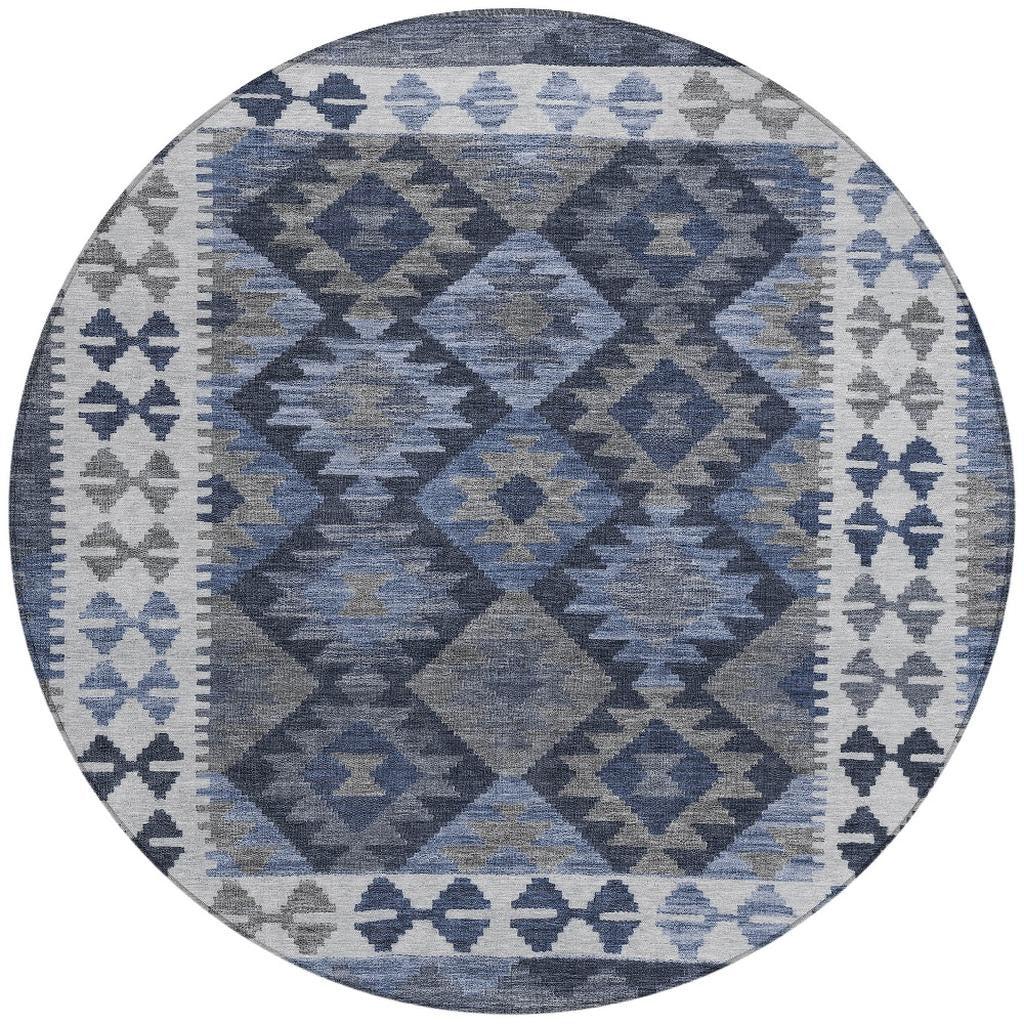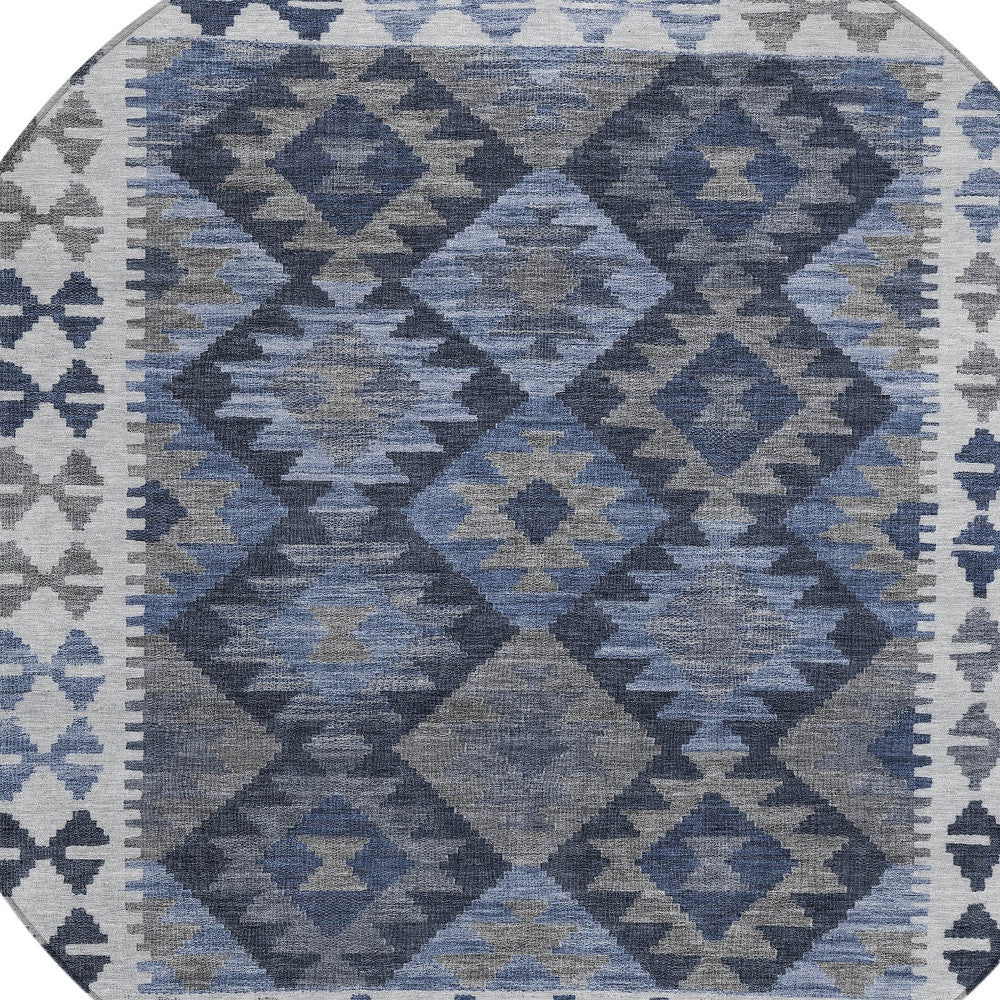 8' Navy Blue Ivory And Gray Round Tribal Washable Indoor Outdoor Area Rug