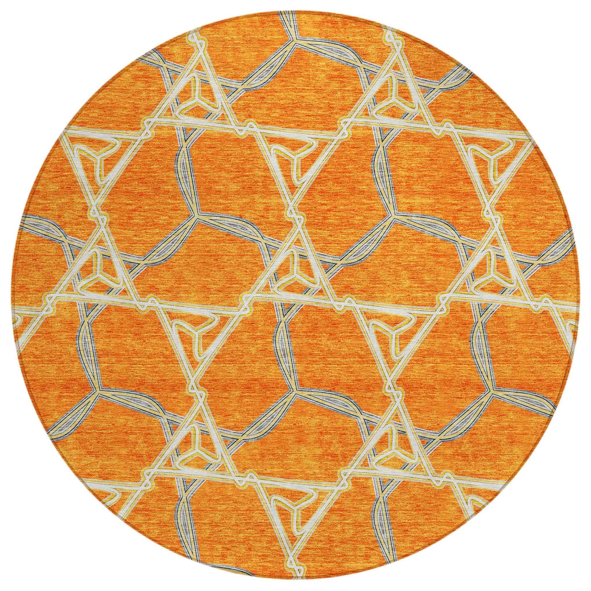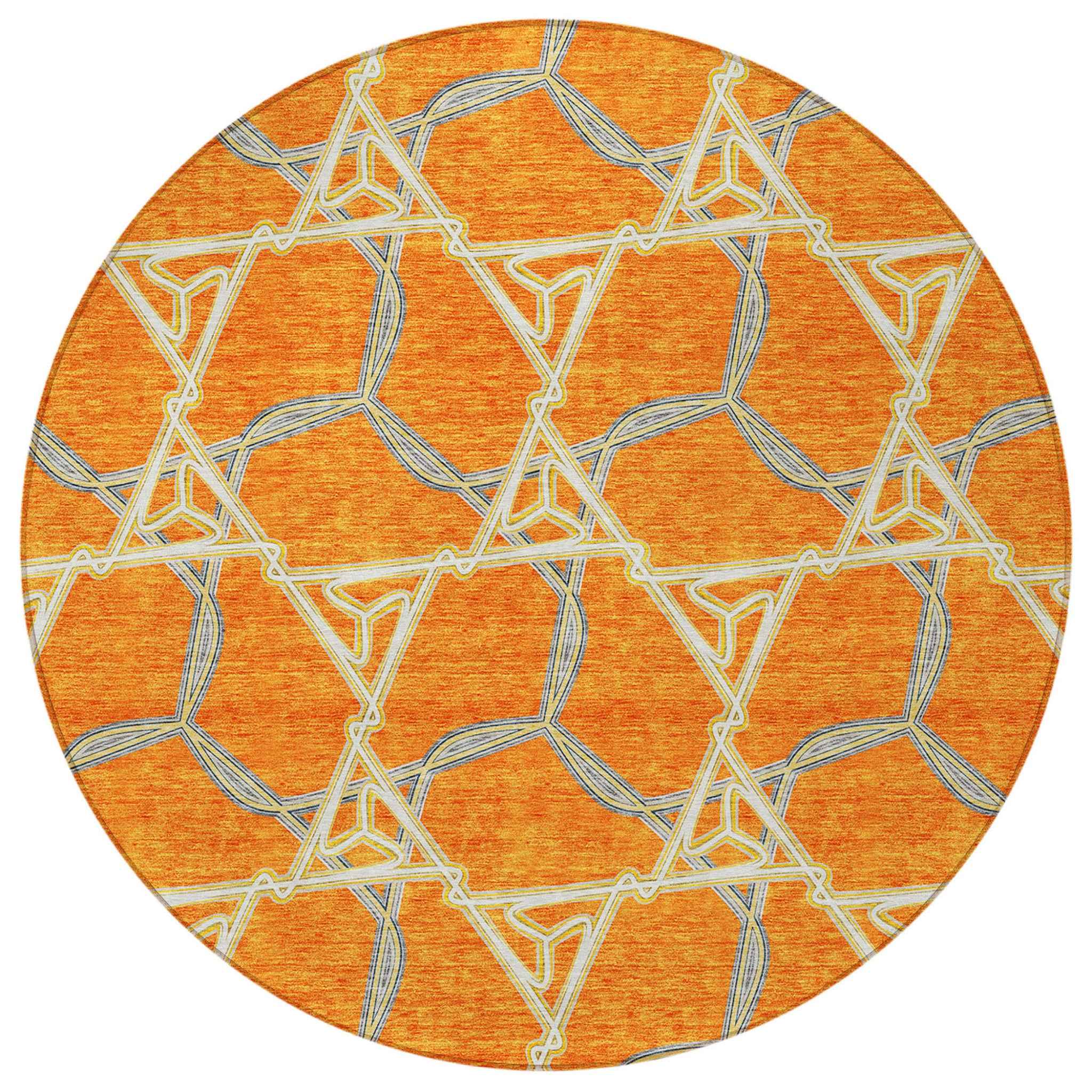 Set an inviting tone in your space with this 8-foot orange and blue round geometric washable indoor outdoor area rug. This geometric round shaped rug features a geometric pattern in orange and blue that combines a good looking print with a unique and updated shape. The mix of shape, color, and design gives this rug refreshing visual interest. Ideal for outdoor spaces or high traffic areas with kids and pets, this rug is made from heavy duty polyester that is stain resistant to help repel water, dirt, and stains. Versatile in use, durable, and easy to maintain, this rug is an ideal solution to add a decorative and inviting touch to your indoor or outdoor space. 96-inch h x 96-inch w x 0.19-inch d.
