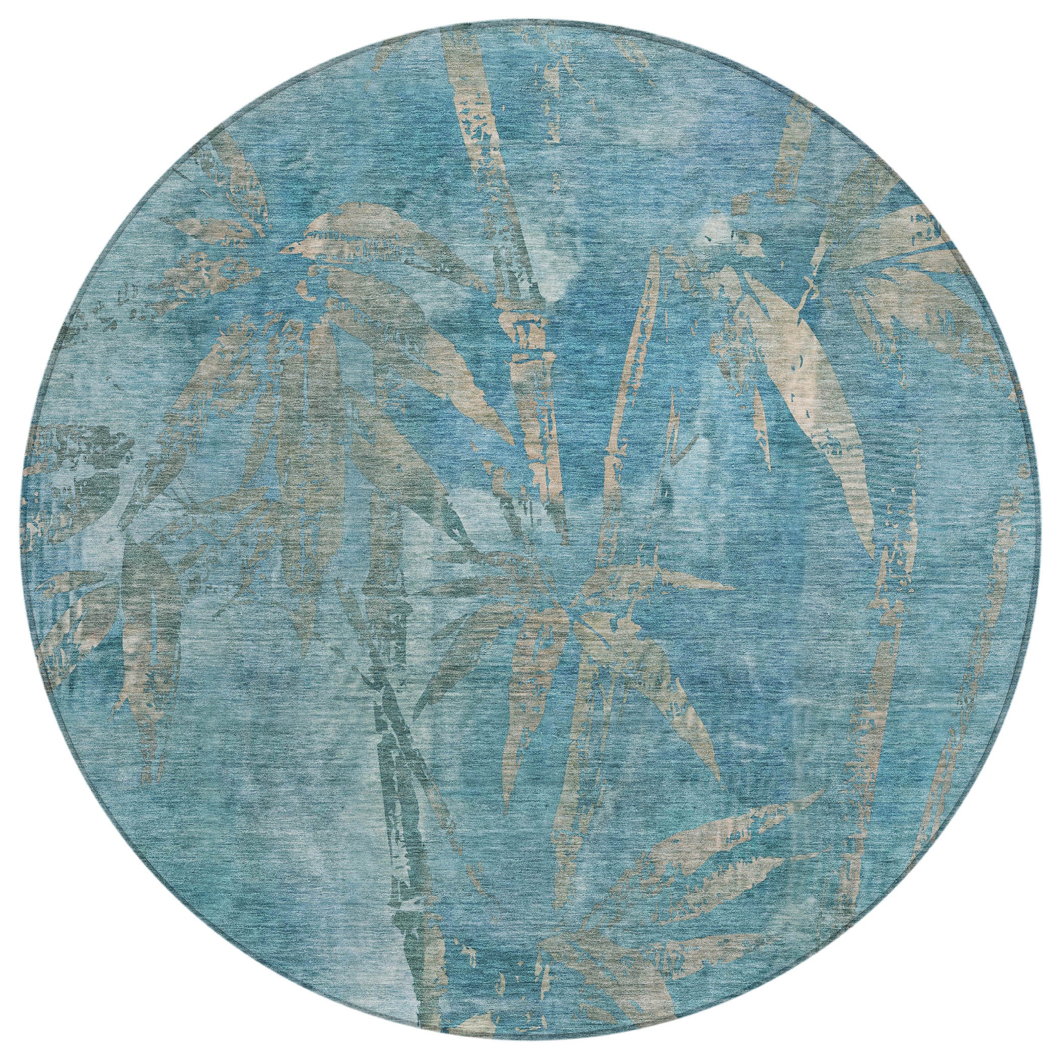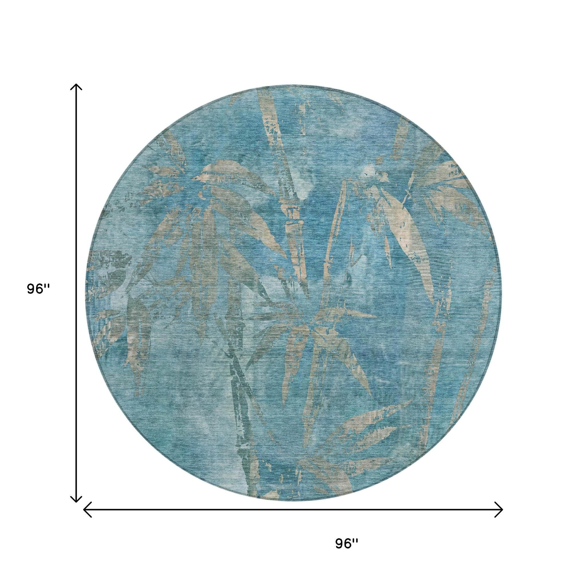 8' Pale Aqua And Beige Round Botanical Leaves Washable Indoor Outdoor Area Rug