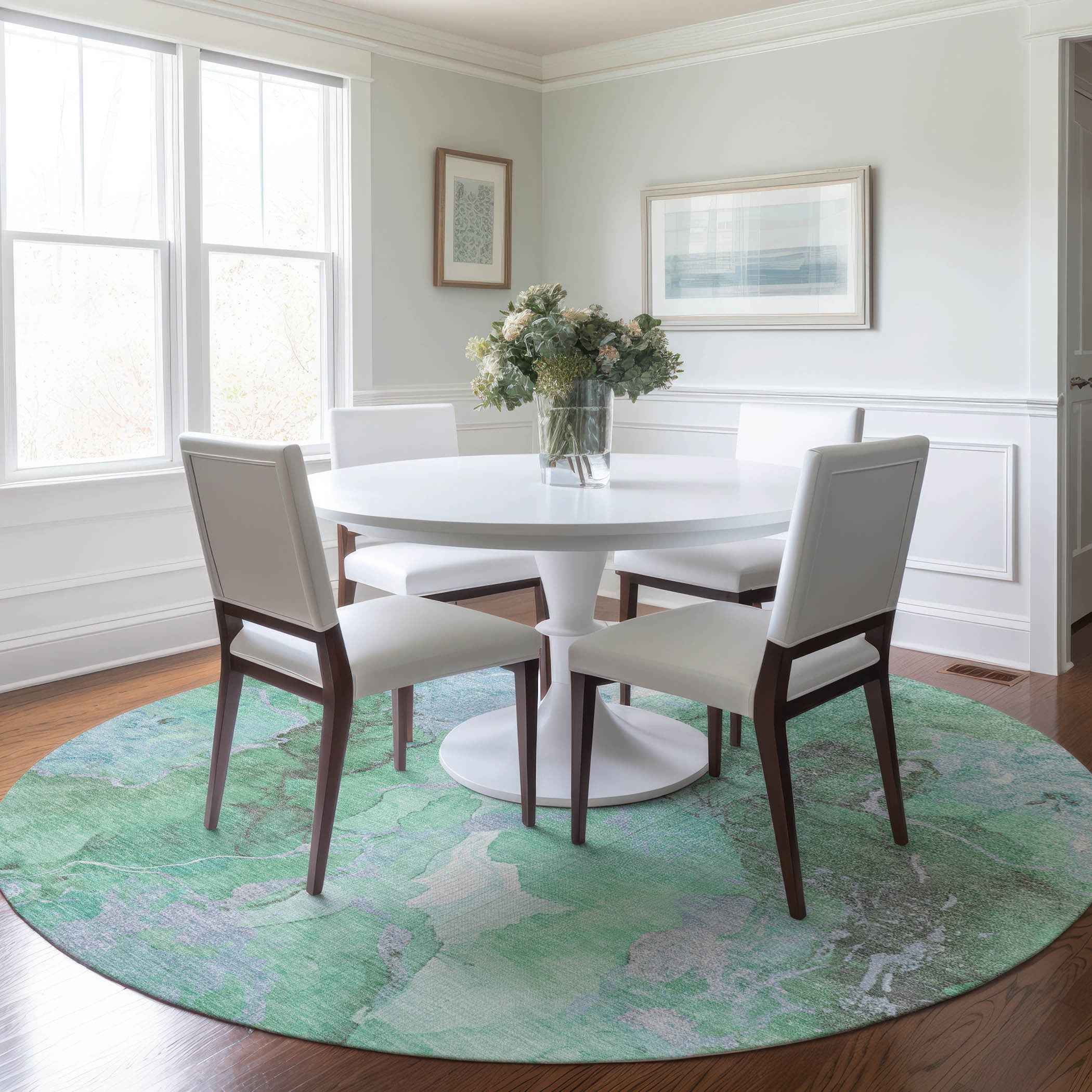 8' Pale Aqua And Mint Green Round Abstract Washable Indoor Outdoor Area Rug