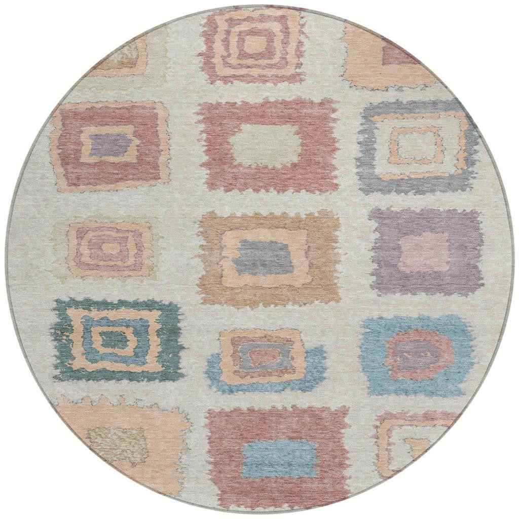 8' Peach Ivory And Beige Round Geometric Washable Indoor Outdoor Area Rug