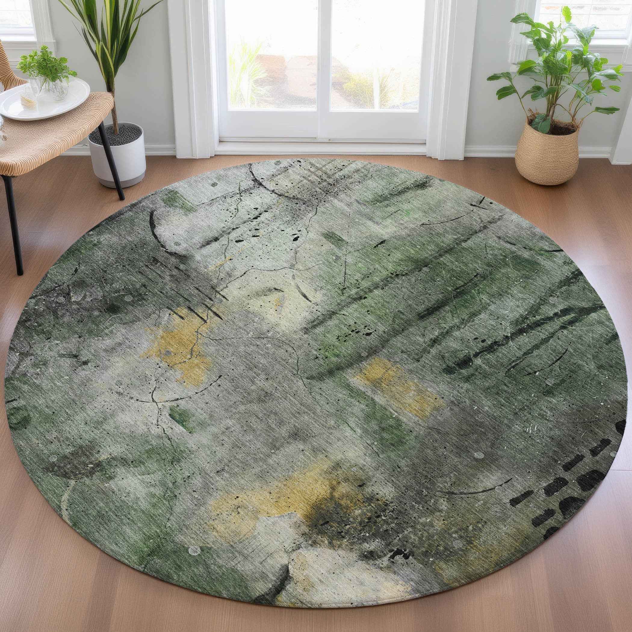 8' Pewter And Gold Round Abstract Washable Indoor Outdoor Area Rug