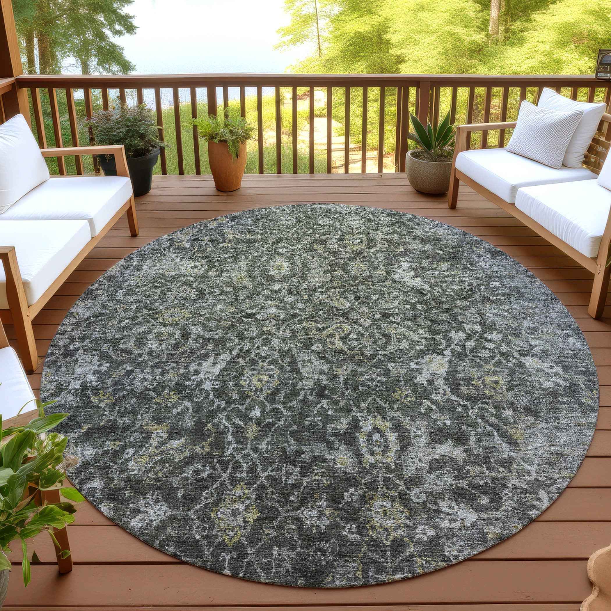 This 8-foot pewter and gray round damask washable indoor outdoor area rug, is a great way to add warmth to a room. This geometric round shaped rug features a damask pattern in pewter and gray that combines a good looking print with a unique and updated shape. The mix of shape, color, and design gives this rug refreshing visual interest. Ideal for outdoor spaces or high traffic areas with kids and pets, this rug is made from heavy duty polyester that is stain resistant to help repel water, dirt, and stains. Versatile in use, durable, and easy to maintain, this rug is an ideal solution to add a decorative and inviting touch to your indoor or outdoor space. 96.00-inch h x 96.00-inch w x 0.19-inch d.