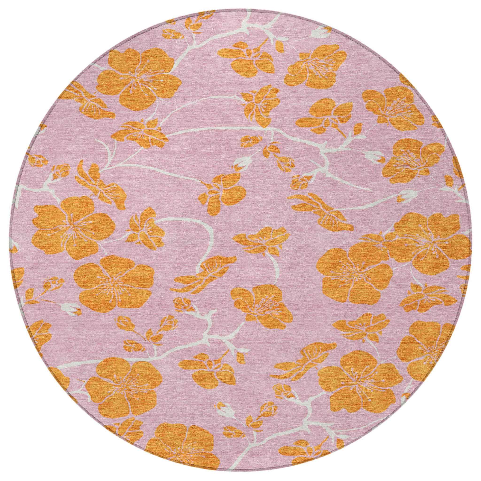 8' Pink And Copper Round Floral Washable Indoor Outdoor Area Rug
