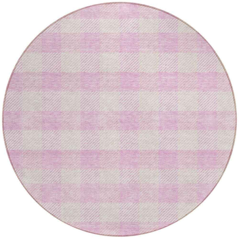 8' Pink And Gray Round Plaid Washable Indoor Outdoor Area Rug
