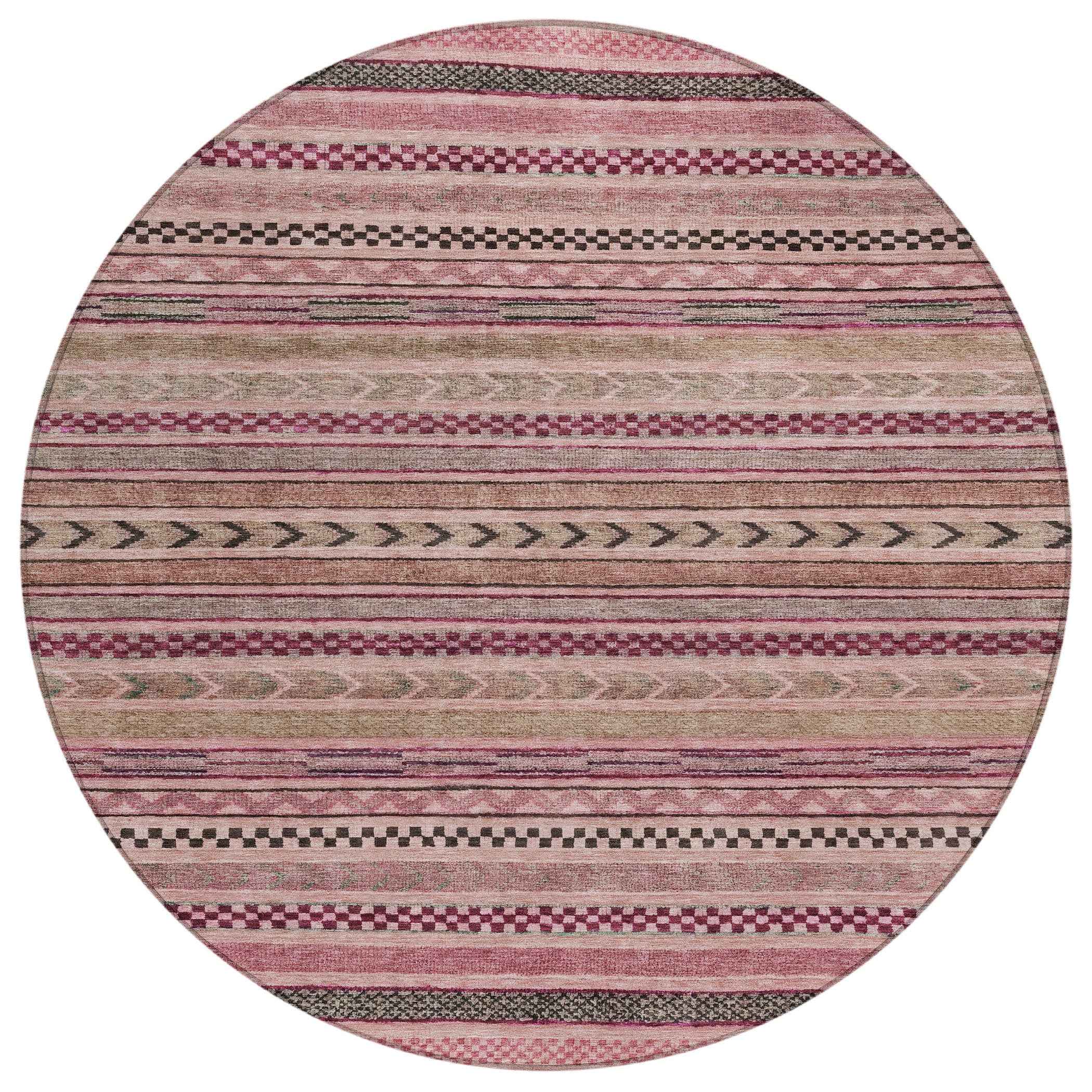 8' Pink And Taupe Round Striped Washable Indoor Outdoor Area Rug