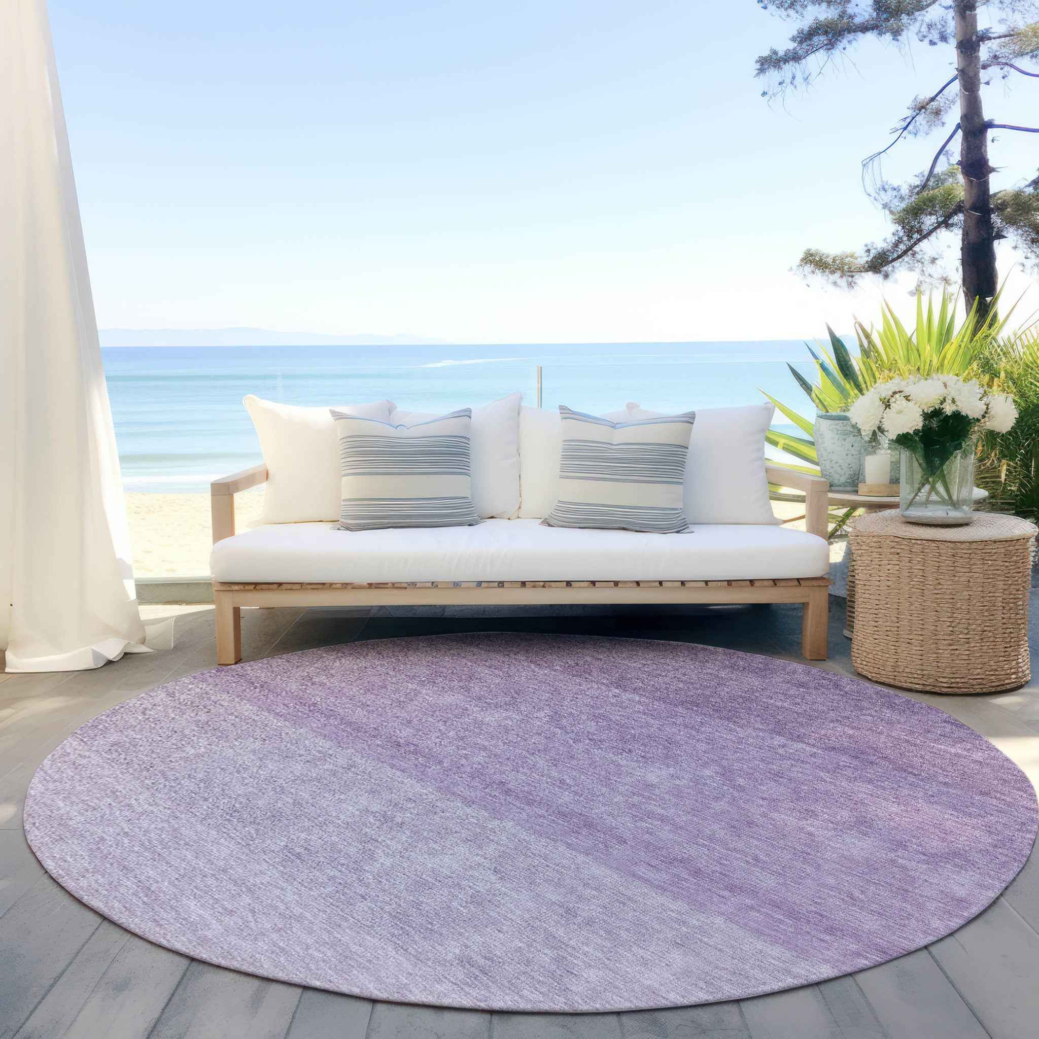 Set an inviting tone in your space with this 8-foot purple and lavender round ombre washable indoor outdoor area rug. This geometric round shaped rug features a ombre pattern in purple and lavender that combines a good looking print with a unique and updated shape. The mix of shape, color, and design gives this rug refreshing visual interest. Ideal for outdoor spaces or high traffic areas with kids and pets, this rug is made from heavy duty polyester that is stain resistant to help repel water, dirt, and stains. Versatile in use, durable, and easy to maintain, this rug is an ideal solution to add a decorative and inviting touch to your indoor or outdoor space. 96-inch h x 96-inch w x 0.19-inch d.