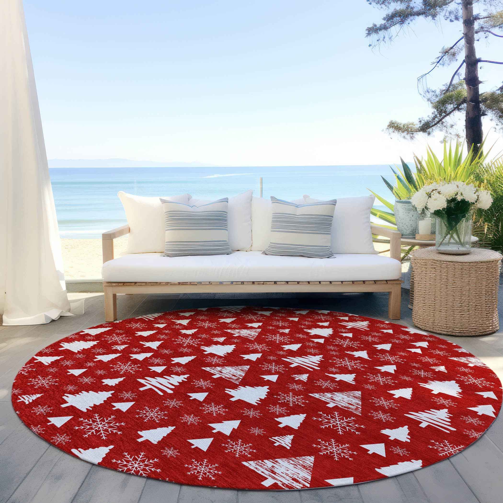 Add some artistry to your room with this 8-foot red and ivory round botanical leaves washable indoor outdoor area rug. This geometric round shaped rug features a botanical leaves pattern in red and ivory that combines a good looking print with a unique and updated shape. The mix of shape, color, and design gives this rug refreshing visual interest. Ideal for outdoor spaces or high traffic areas with kids and pets, this rug is made from heavy duty polyester that is stain resistant to help repel water, dirt, and stains. Makes a great way to dress up your patio, porch, or poolside, but also works well as a durable and easy to maintain option in the kitchen, family room, or mudroom. 96-inch h x 96-inch w x 0.19-inch d.