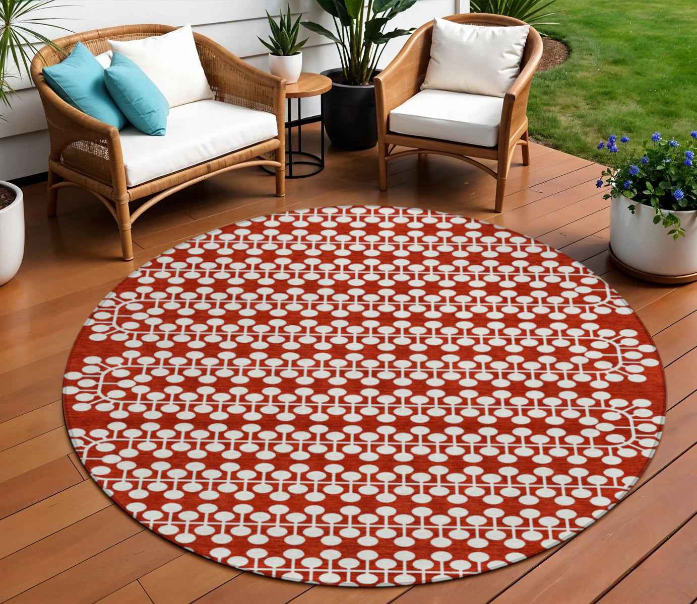 8' Red And Ivory Round Geometric Washable Indoor Outdoor Area Rug