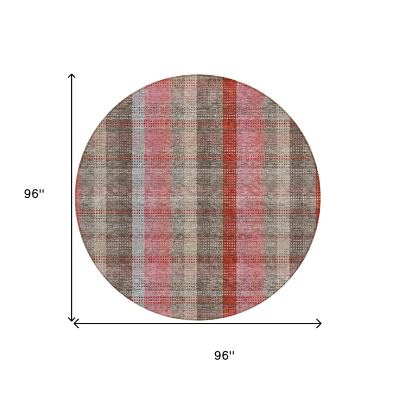 8' Red Pink And Pewter Round Plaid Washable Indoor Outdoor Area Rug