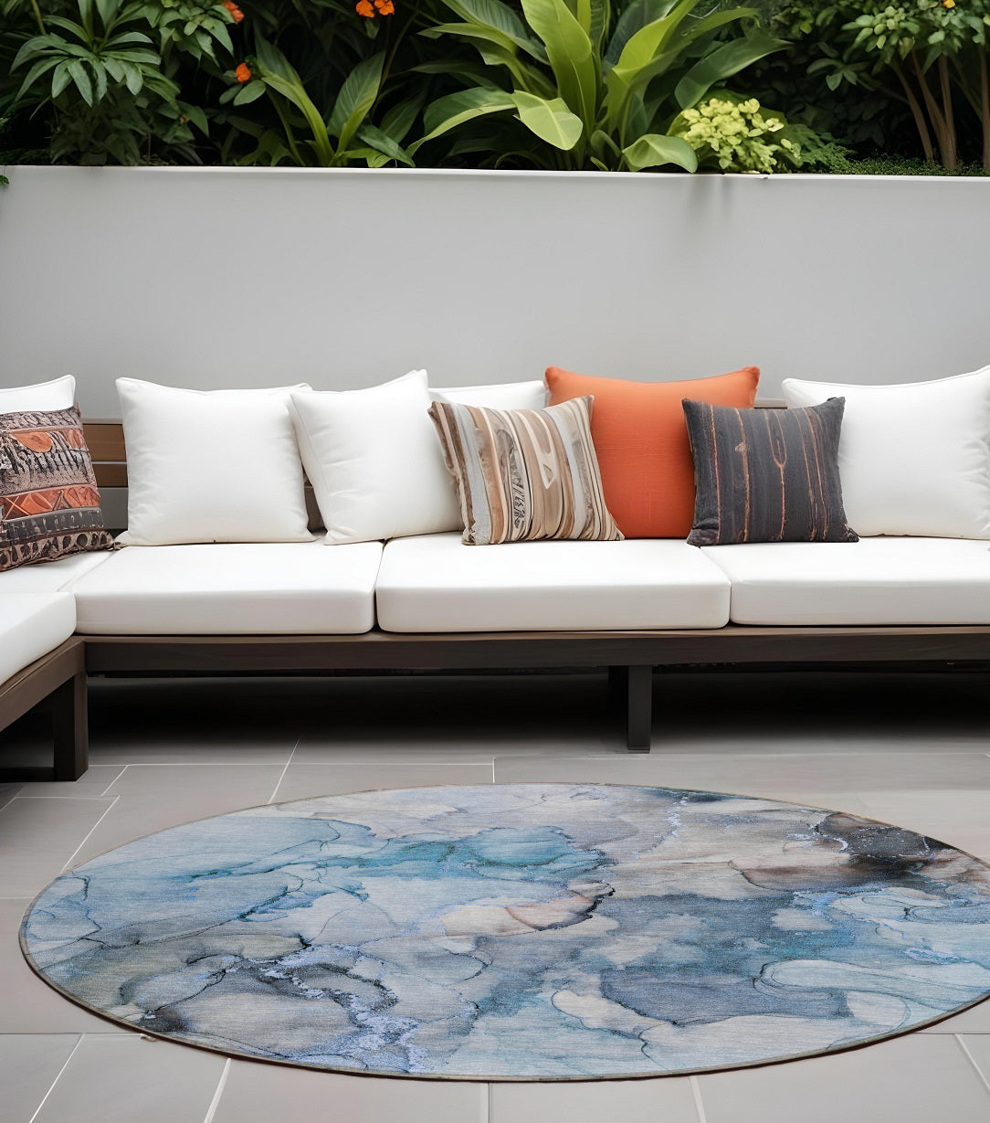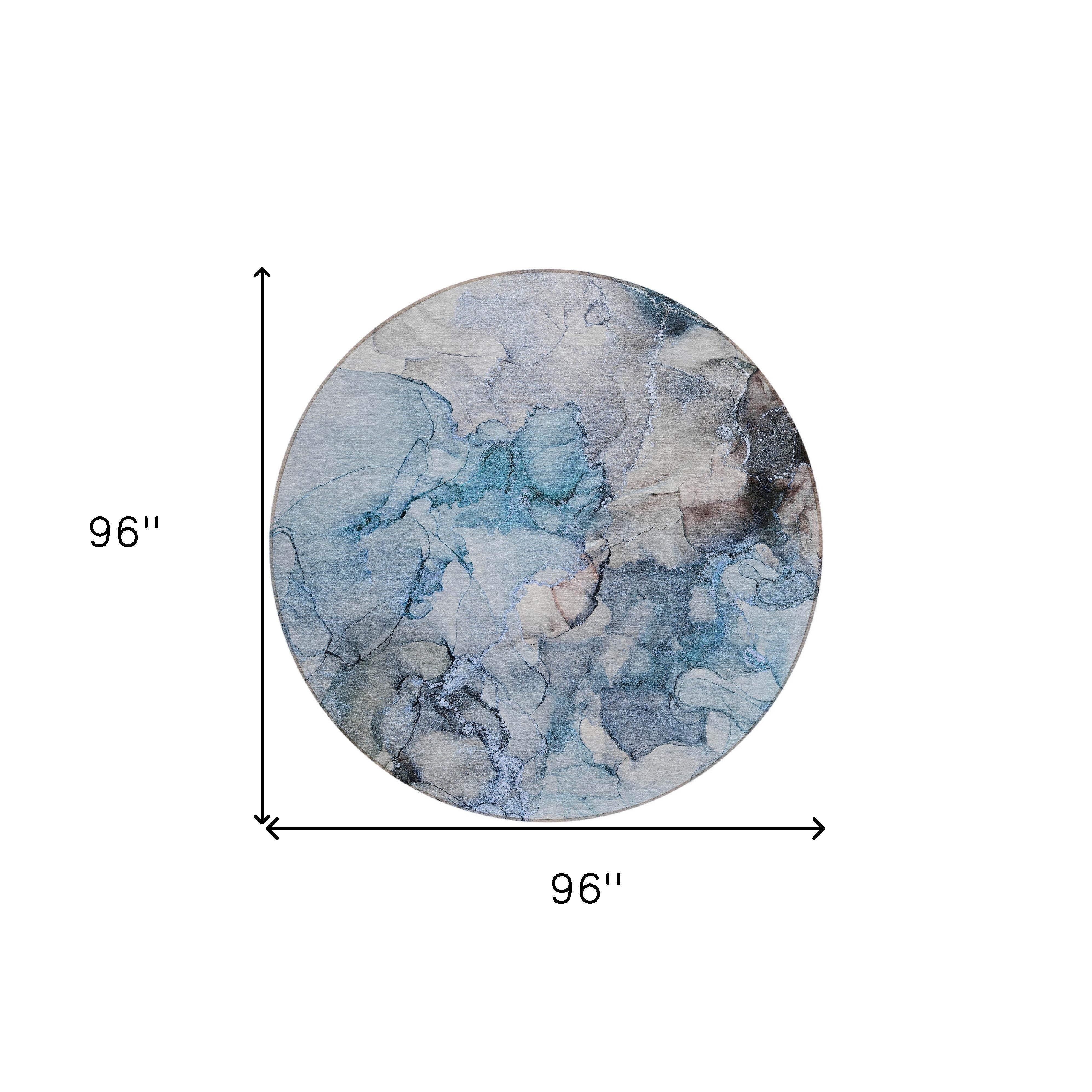 8' Round Blue and Gray Round Abstract Washable Non Skid Indoor Outdoor Area Rug
