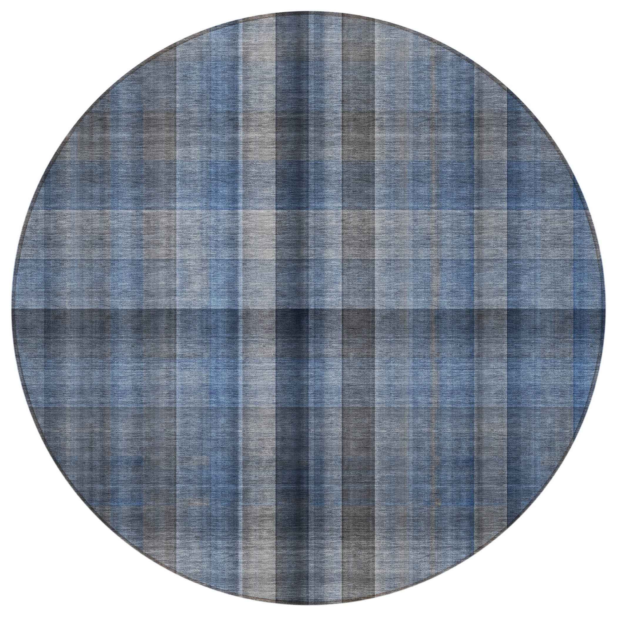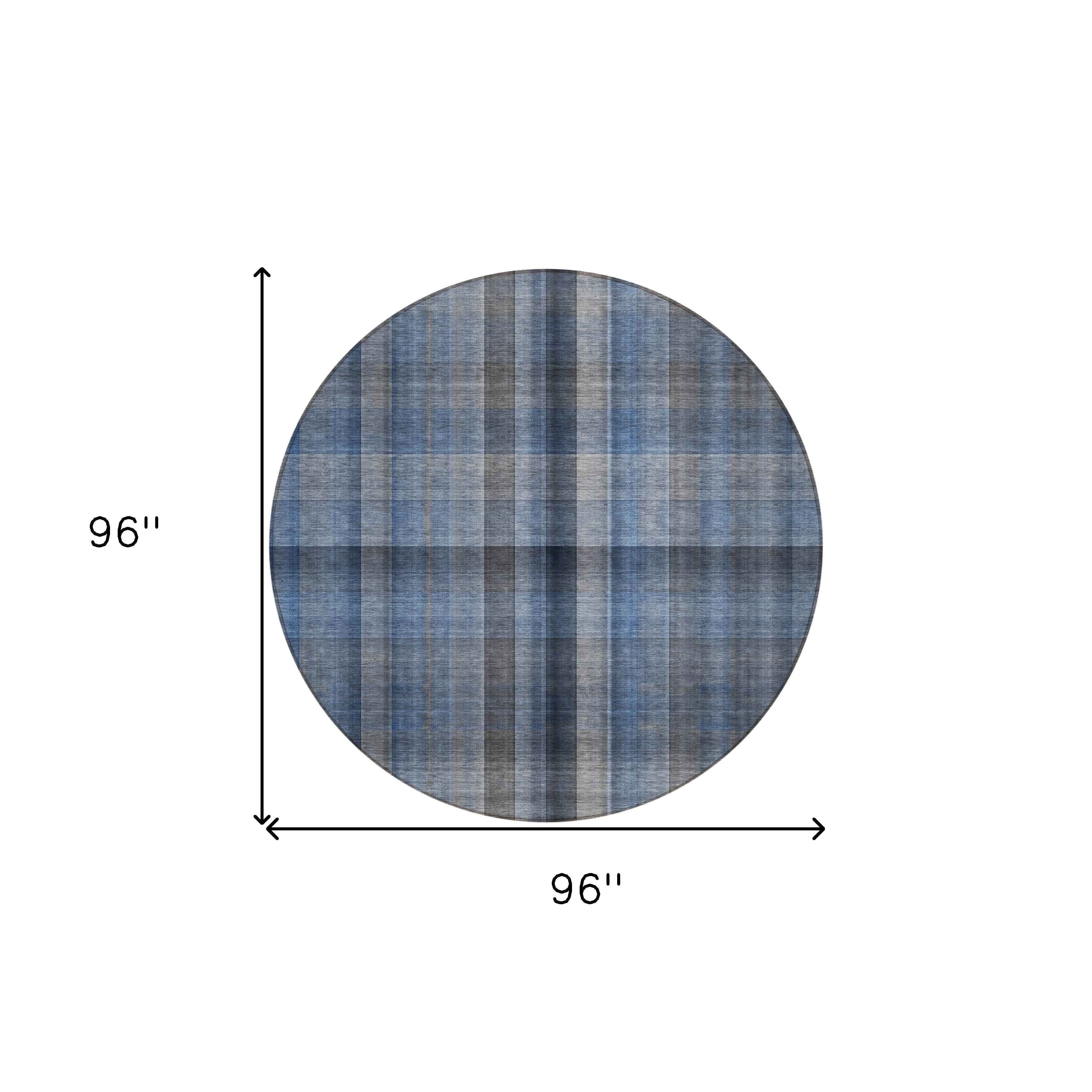 8' Round Blue Round Plaid Washable Non Skid Indoor Outdoor Area Rug