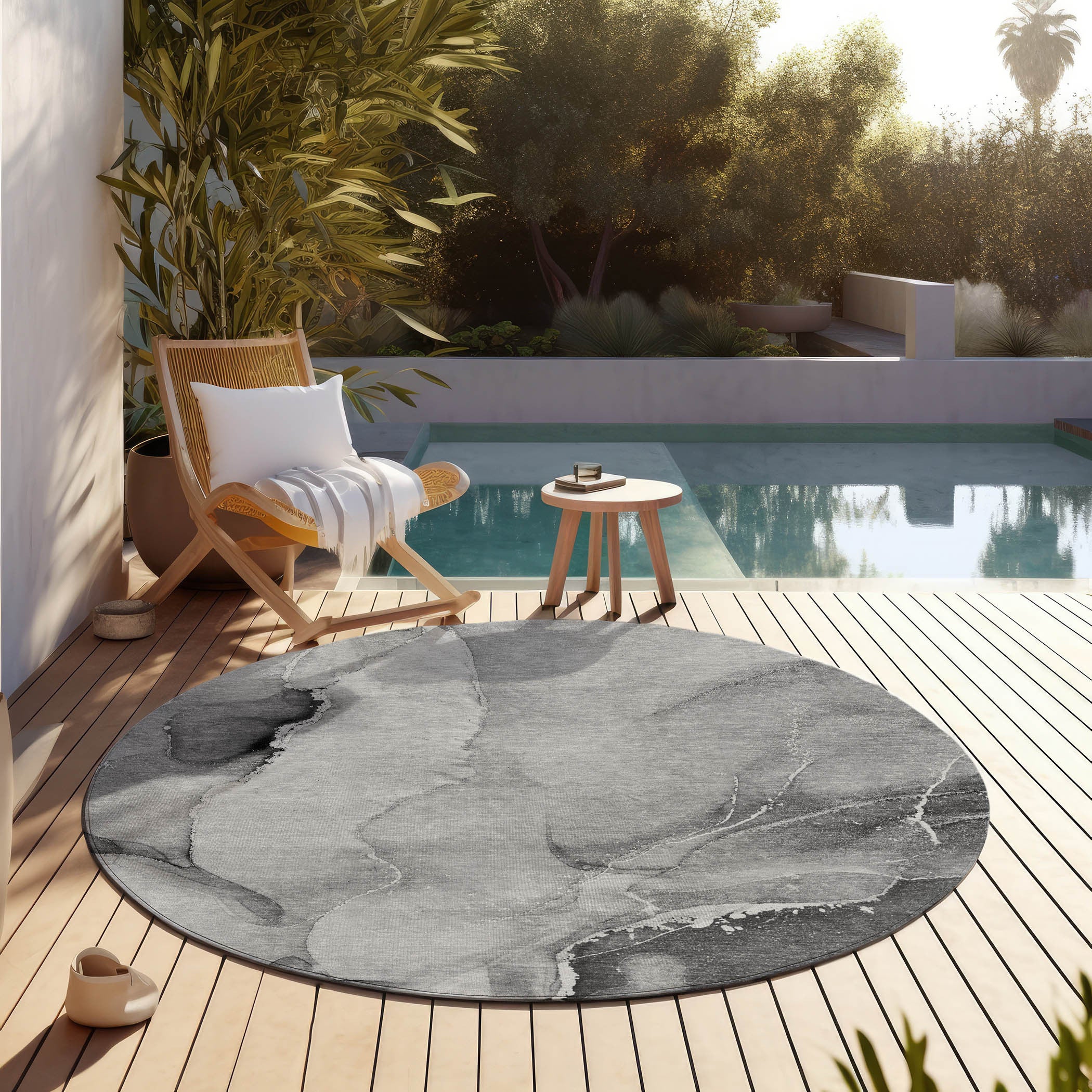 This 8-foot round gray and ivory round abstract washable stain resistant non skid indoor outdoor area rug, is a great way to add warmth to a room. This geometric round shaped rug features a abstract pattern in gray and ivory that combines a good looking print with a unique and updated shape. The mix of shape, color, and design gives this rug refreshing visual interest. Ideal for spaces with kids and pets, this rug is stain resistant to help repel stains and spilled liquids. Area rugs help to give warmth and sense of home to your space. 96-inch H x 96-inch W x 0.19-inch D