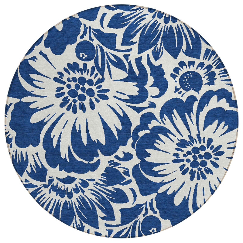 8' Round Navy and Ivory Round Floral Washable Non Skid Indoor Outdoor Area Rug