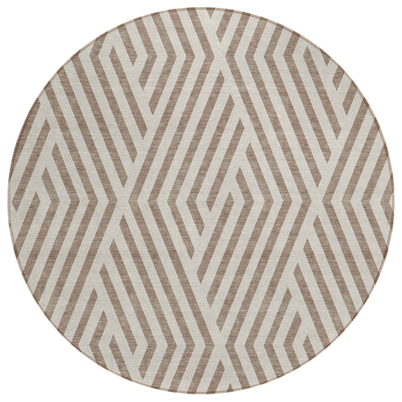8' Round Taupe and Ivory Round Geometric Washable Non Skid Indoor Outdoor Area Rug