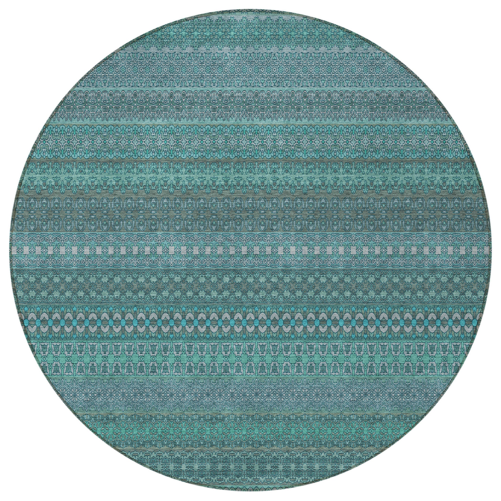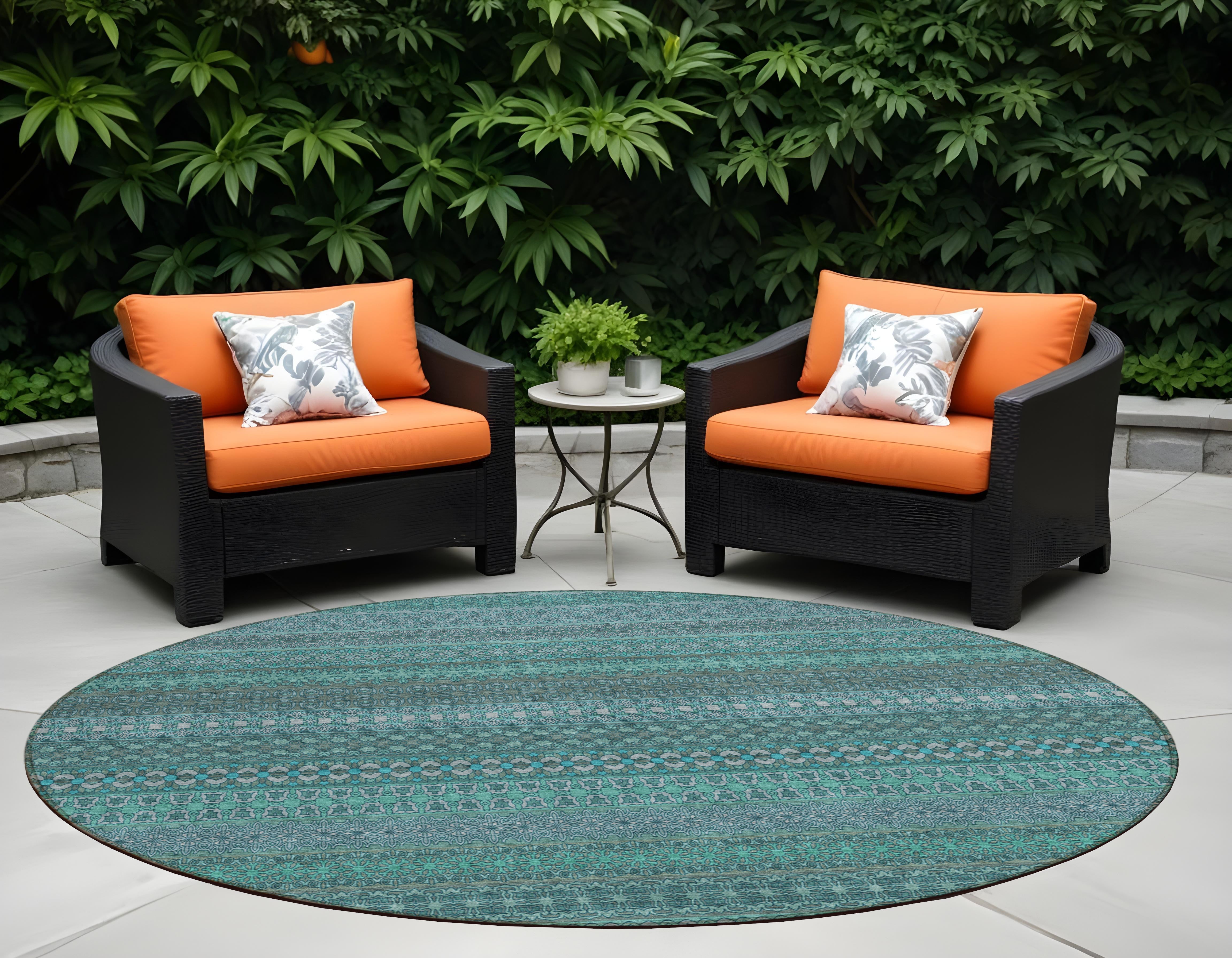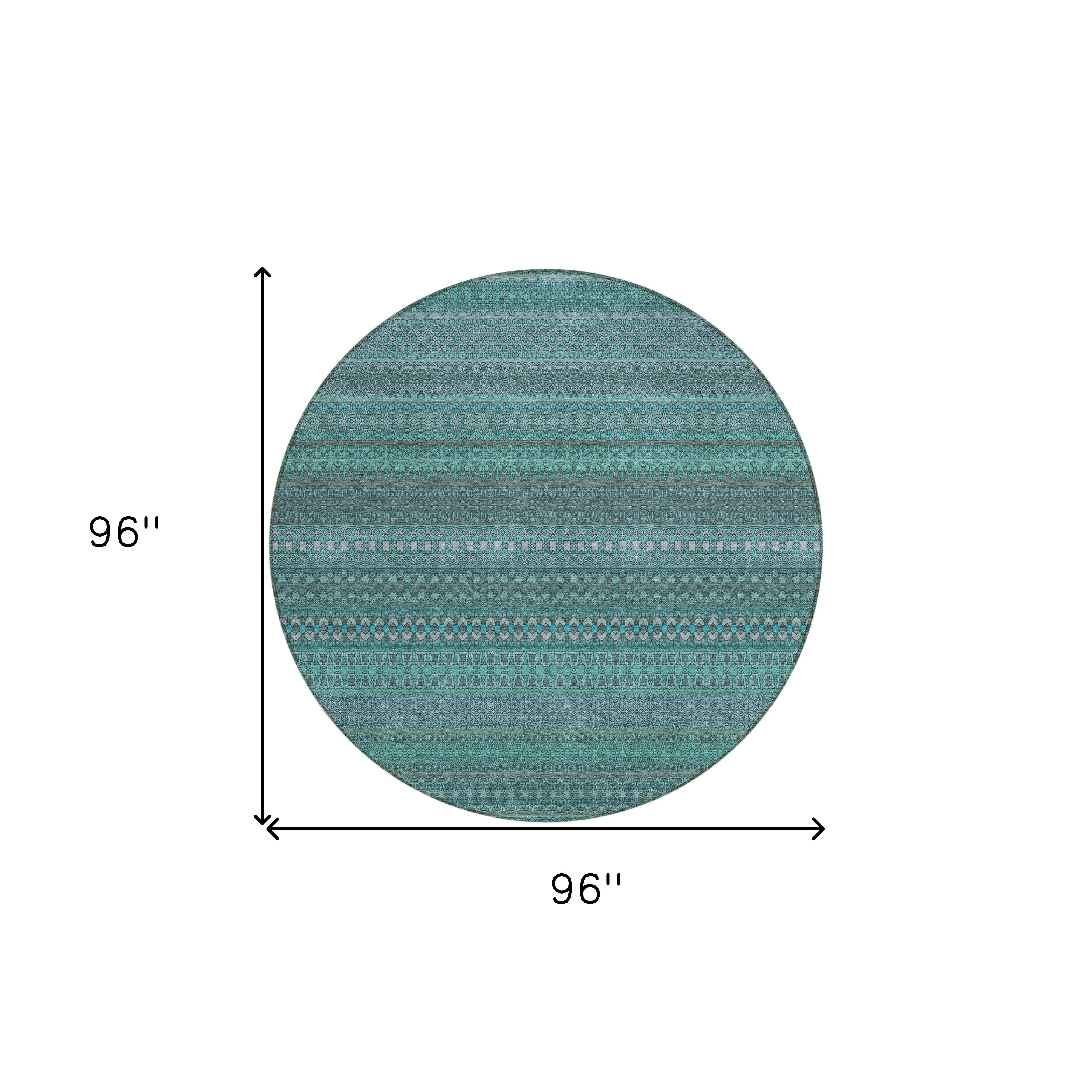 8' Round Turquoise Round Striped Washable Non Skid Indoor Outdoor Area Rug