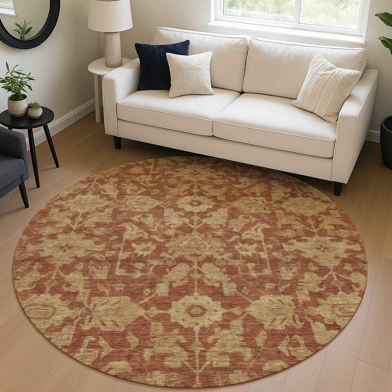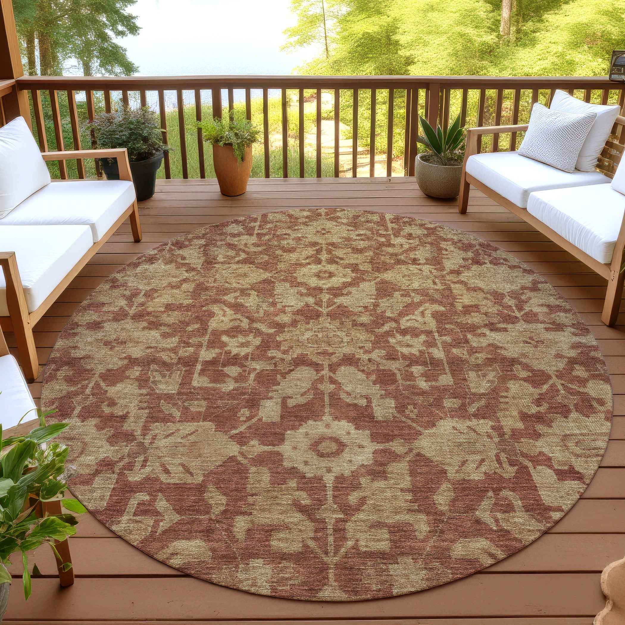 8' Rust And Beige Round Floral Washable Indoor Outdoor Area Rug