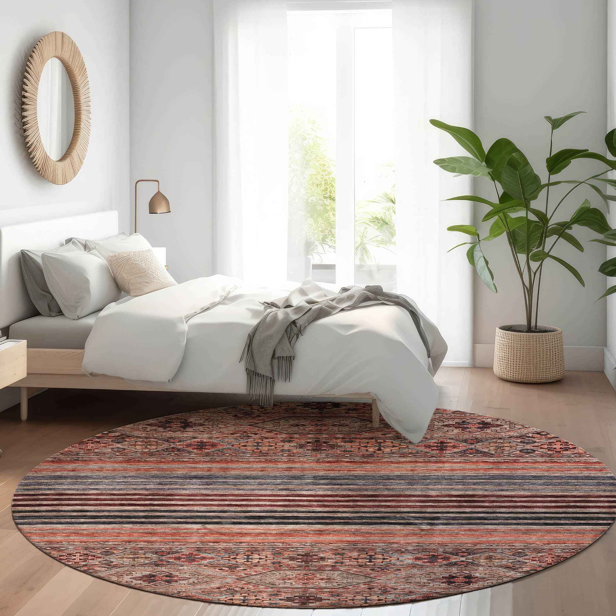 This 8-foot rust gray and salmon round medallion washable indoor outdoor area rug, is a great way to add warmth to a room. This geometric round shaped rug features a medallion pattern in rust, gray, and salmon that combines a good looking print with a unique and updated shape. The mix of shape, color, and design gives this rug refreshing visual interest. Ideal for outdoor spaces or high traffic areas with kids and pets, this rug is made from heavy duty polyester that is stain resistant to help repel water, dirt, and stains. Versatile in use, durable, and easy to maintain, this rug is an ideal solution to add a decorative and inviting touch to your indoor or outdoor space. 96-inch h x 96-inch w x 0.19-inch d.