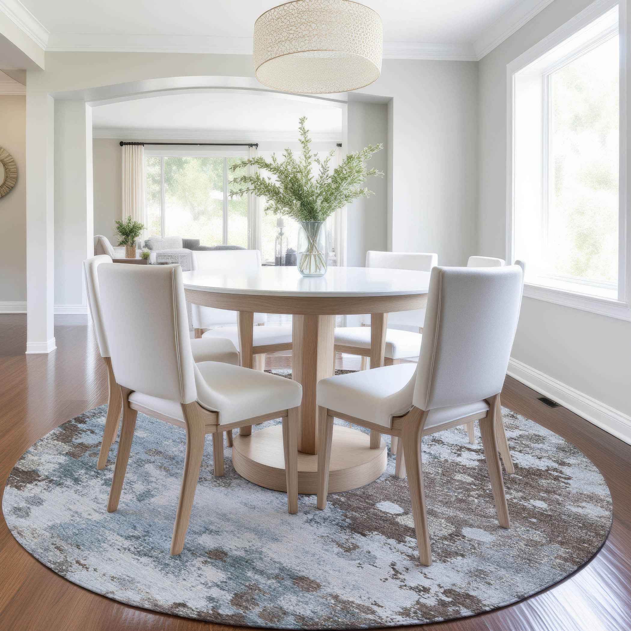 8' Sky Blue And Brown Round Abstract Washable Indoor Outdoor Area Rug