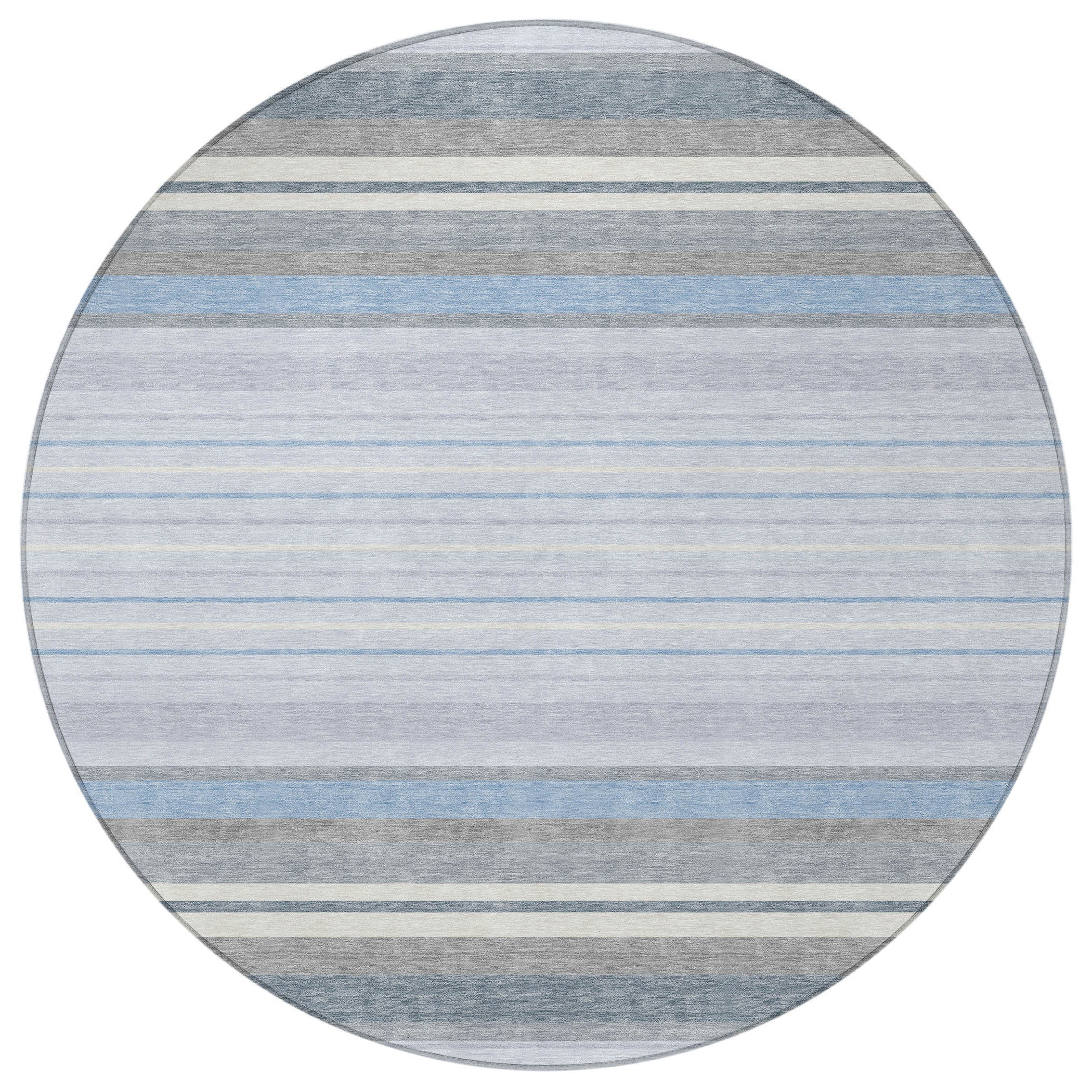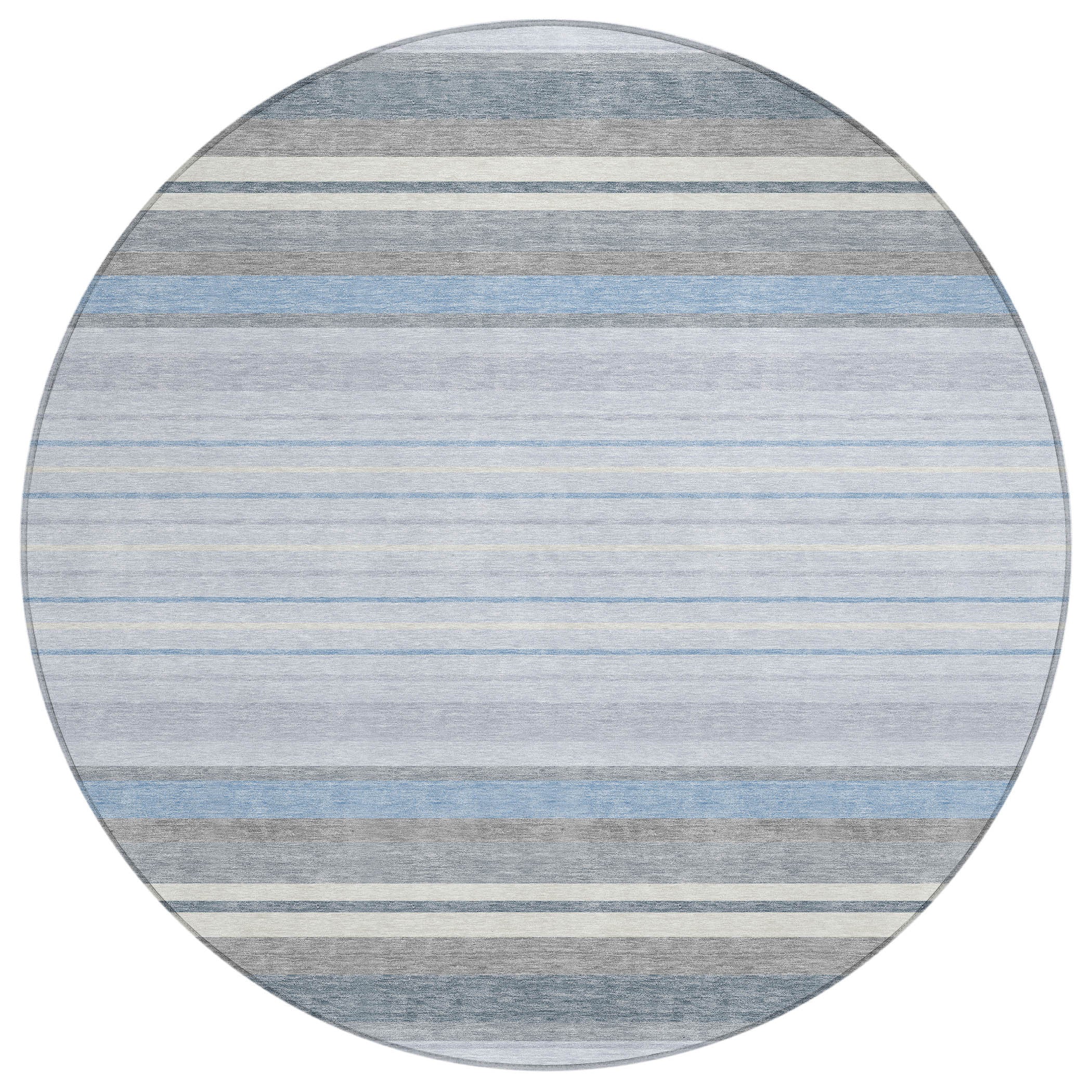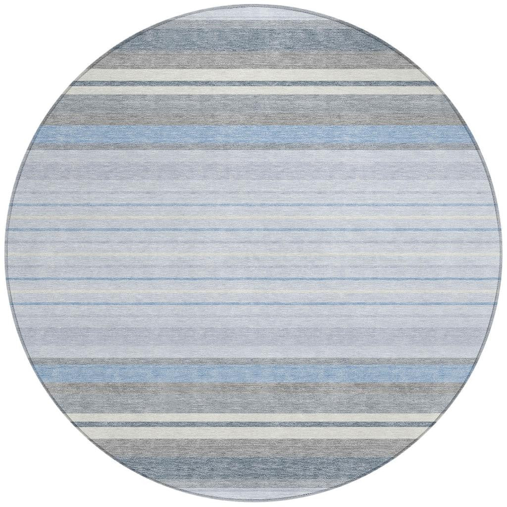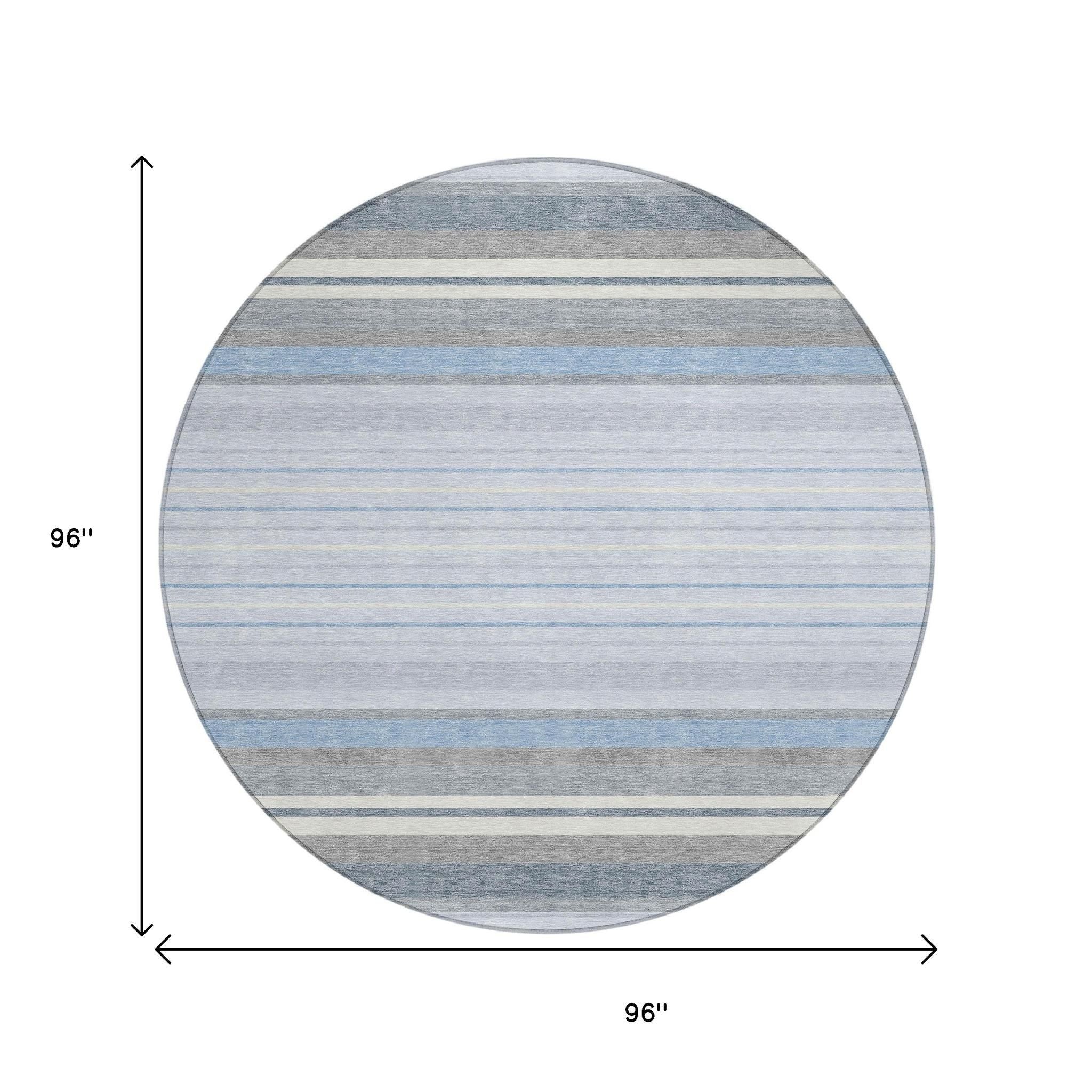 8' Sky Blue And Ivory Round Striped Washable Indoor Outdoor Area Rug