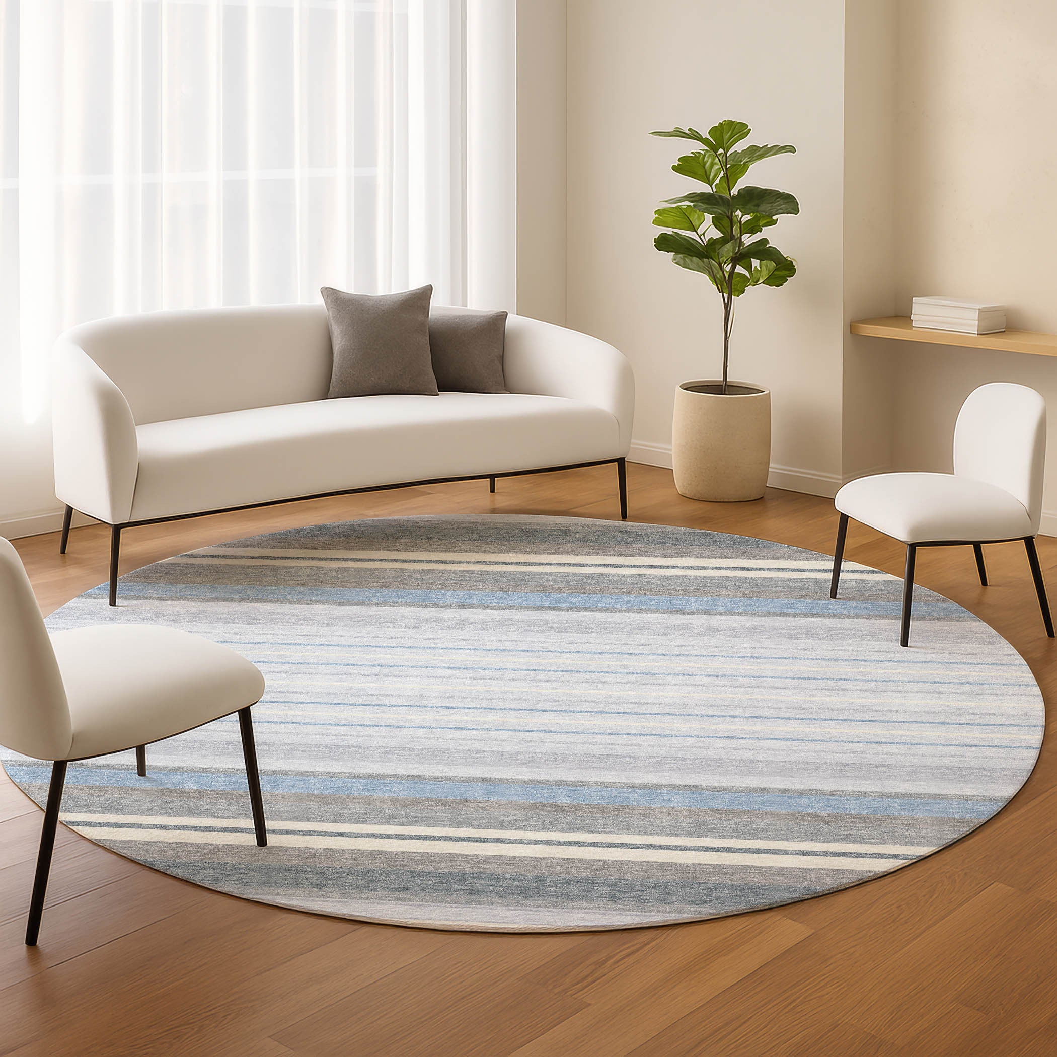 This 8-foot sky blue and ivory round striped washable indoor outdoor area rug, is a great way to add warmth to a room. This geometric round shaped rug features a striped pattern in sky blue and ivory that combines a good looking print with a unique and updated shape. The mix of shape, color, and design gives this rug refreshing visual interest. Ideal for outdoor spaces or high traffic areas with kids and pets, this rug is made from heavy duty polyester that is stain resistant to help repel water, dirt, and stains. Makes a great way to dress up your patio, porch, or poolside, but also works well as a durable and easy to maintain option in the kitchen, family room, or mudroom. 96.00-inch h x 96.00-inch w x 0.19-inch d.