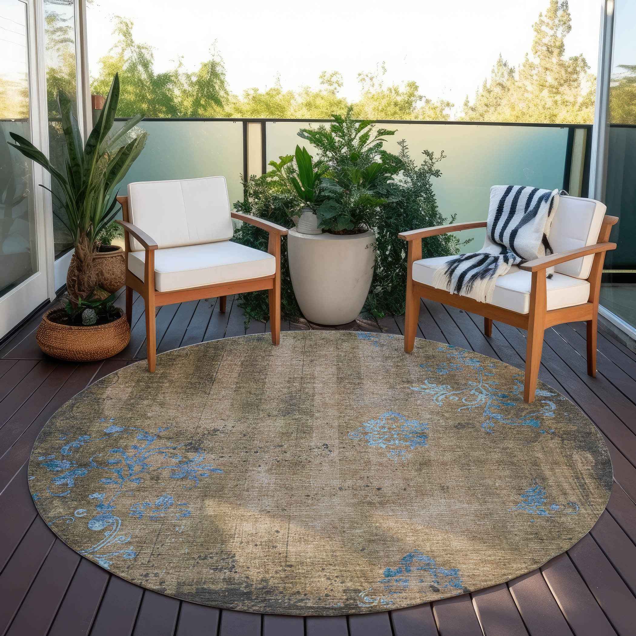 8' Taupe And Blue Round Floral Washable Indoor Outdoor Area Rug