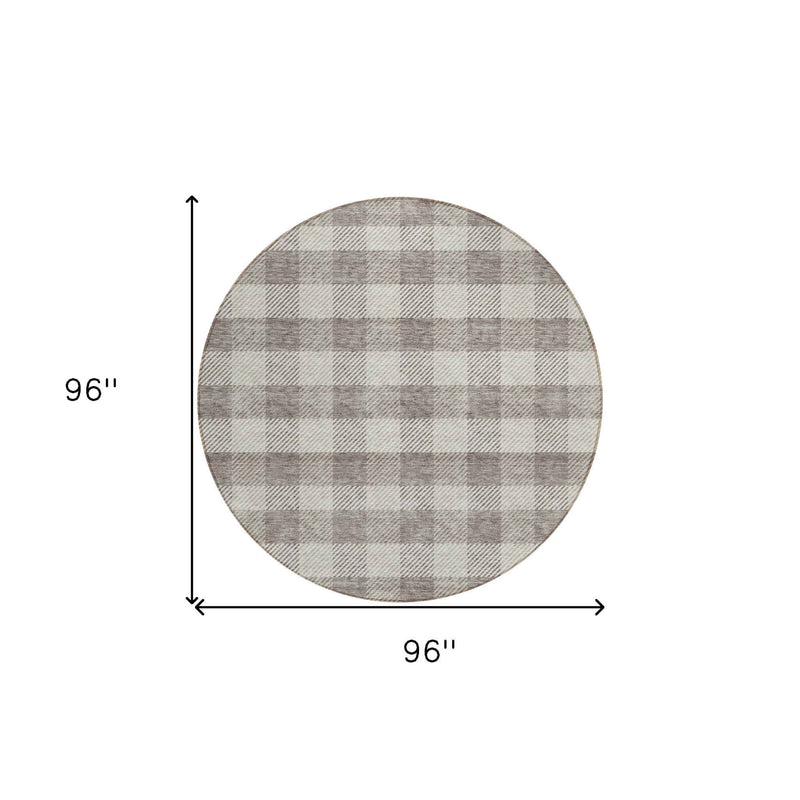 8' Taupe And Gray Round Plaid Washable Indoor Outdoor Area Rug