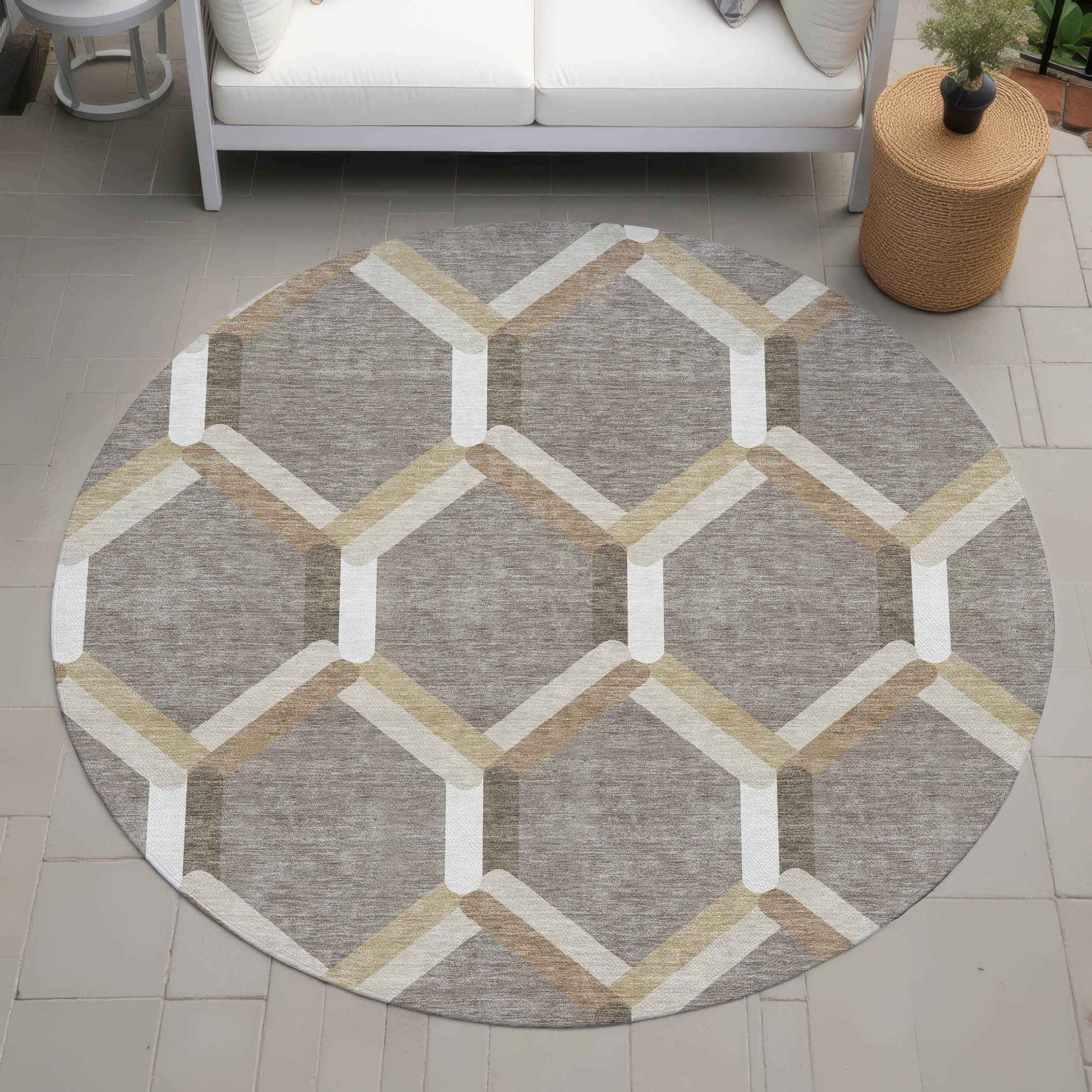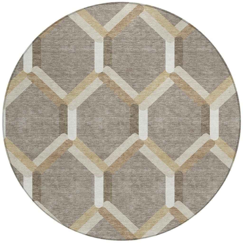 8' Taupe Beige And Ivory Round Geometric Washable Indoor Outdoor Area Rug