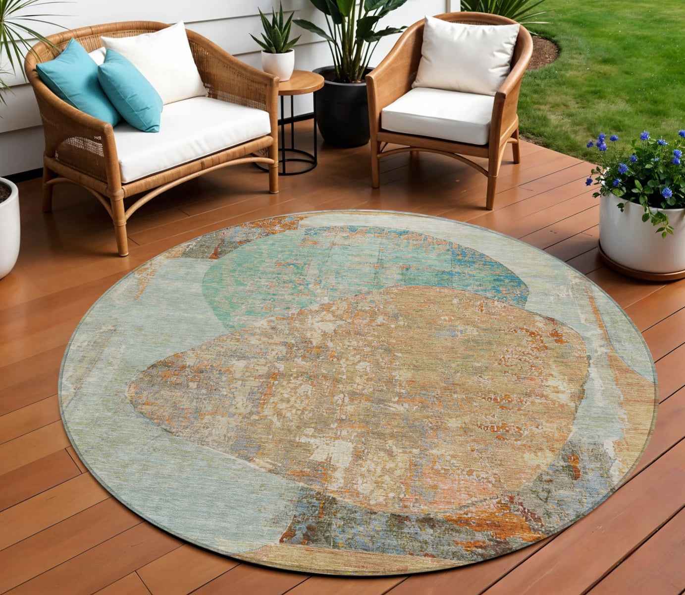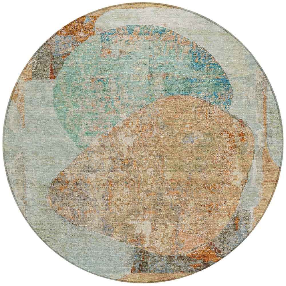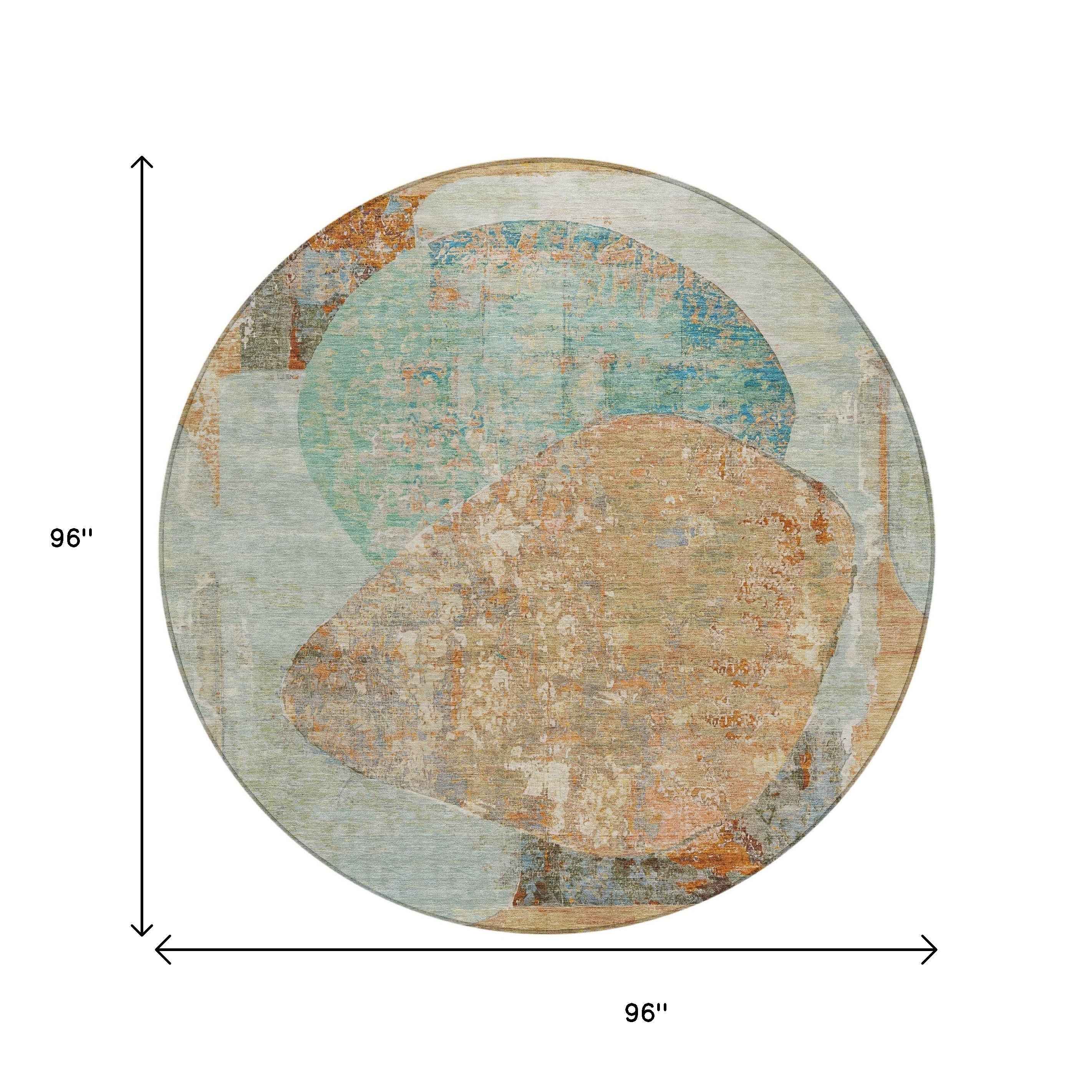 8' Teal Blue And Copper Round Abstract Washable Indoor Outdoor Area Rug