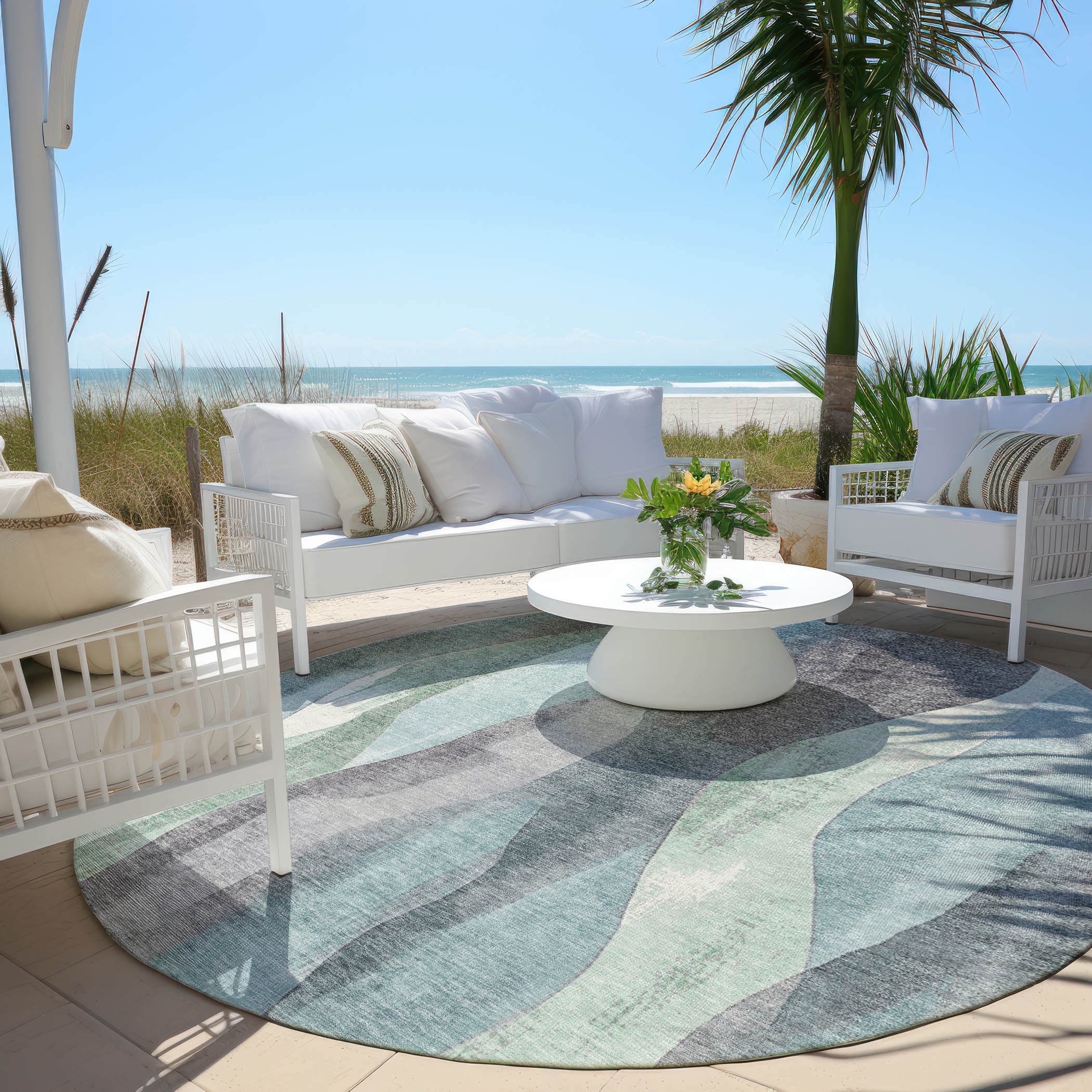 Add some artistry to your room with this 8-foot teal blue and fern green round abstract washable indoor outdoor area rug. This geometric round shaped rug features a abstract pattern in teal blue and fern green that combines a good looking print with a unique and updated shape. The mix of shape, color, and design gives this rug refreshing visual interest. Ideal for outdoor spaces or high traffic areas with kids and pets, this rug is made from heavy duty polyester that is stain resistant to help repel water, dirt, and stains. Versatile in use, durable, and easy to maintain, this rug is an ideal solution to add a decorative and inviting touch to your indoor or outdoor space. 96-inch h x 96-inch w x 0.19-inch d.