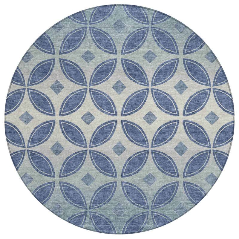 8' Teal Blue And Ivory Round Geometric Washable Indoor Outdoor Area Rug 跳到内容