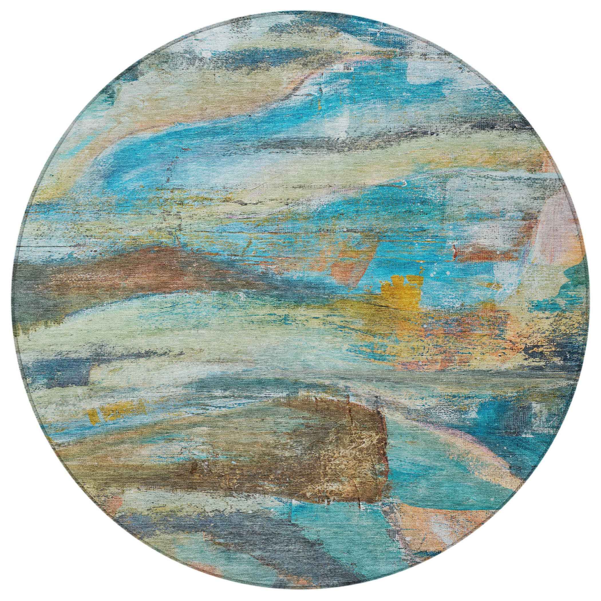 8' Teal Blue Copper And Beige Round Abstract Washable Indoor Outdoor Area Rug