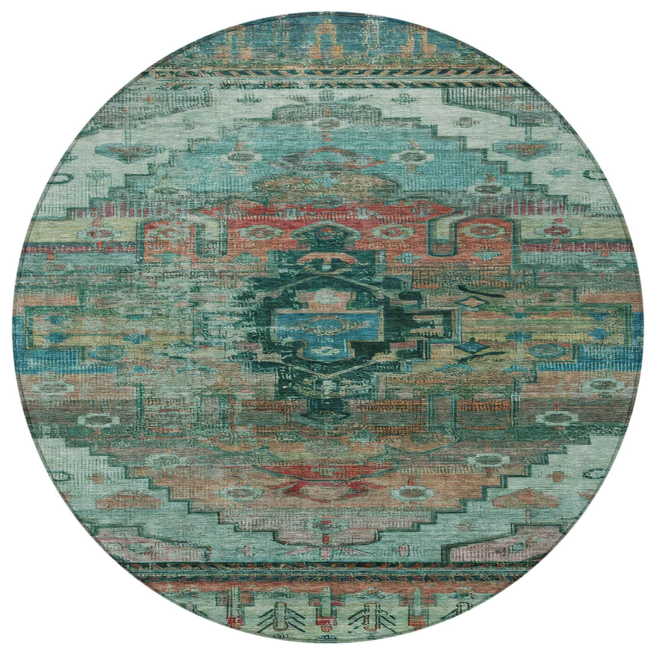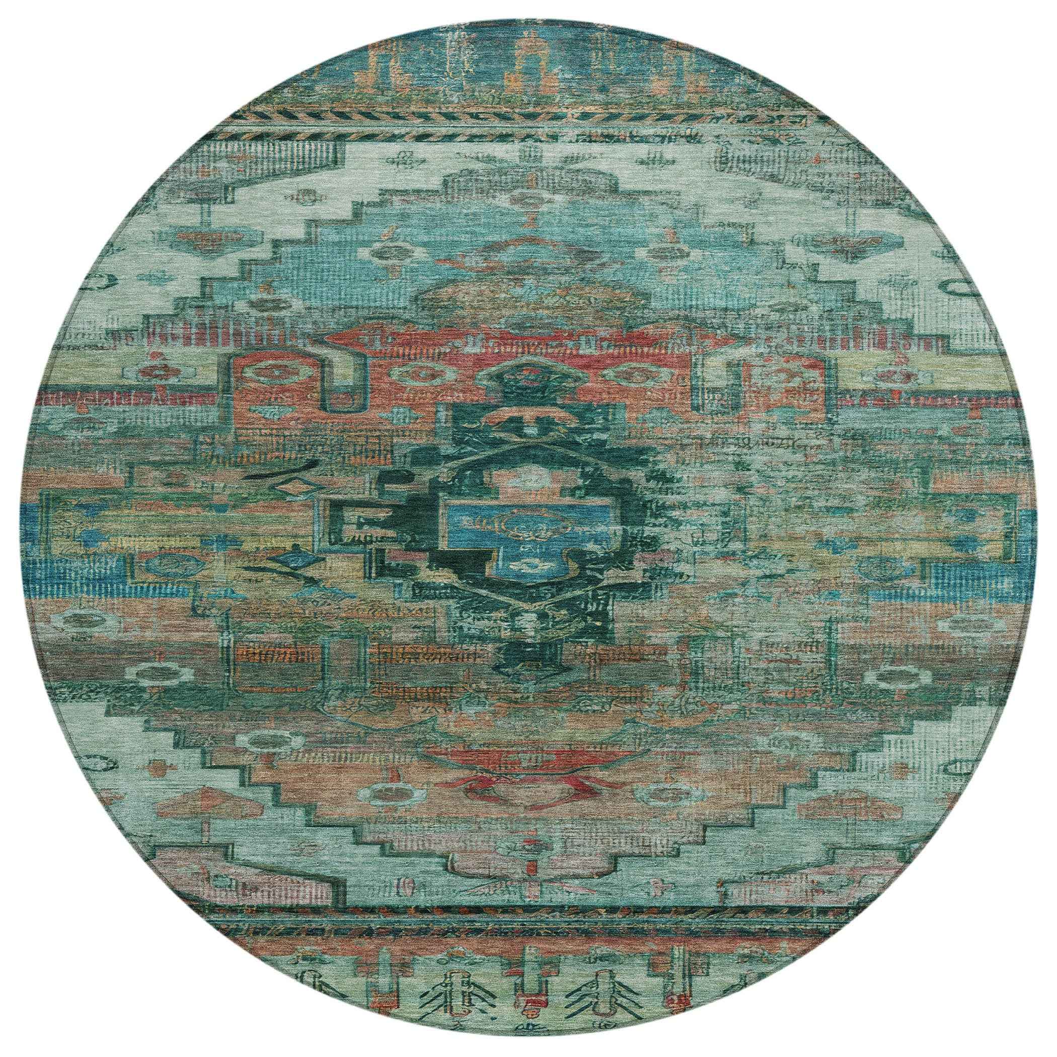 8' Teal Blue Copper And Gold Round Tribal Washable Indoor Outdoor Area Rug